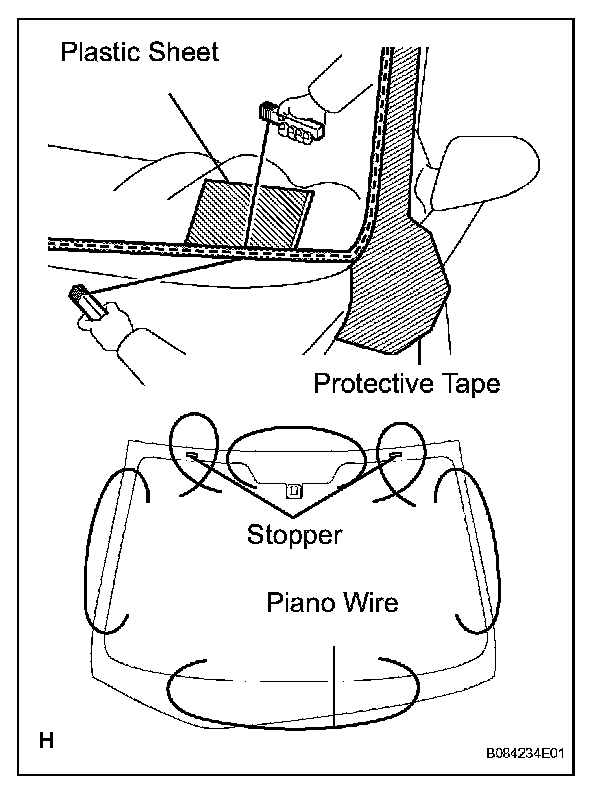 b. From the interior, insert a piano wire between the vehicle body and glass as shown in the illustration.