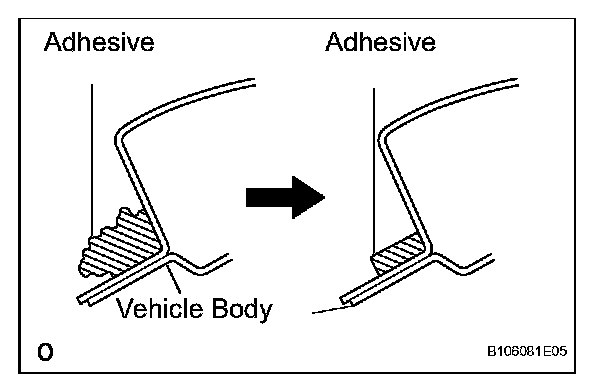 1. On the contact surface of the vehicle body, use a knife to cut away excess adhesive as shown in the illustration.