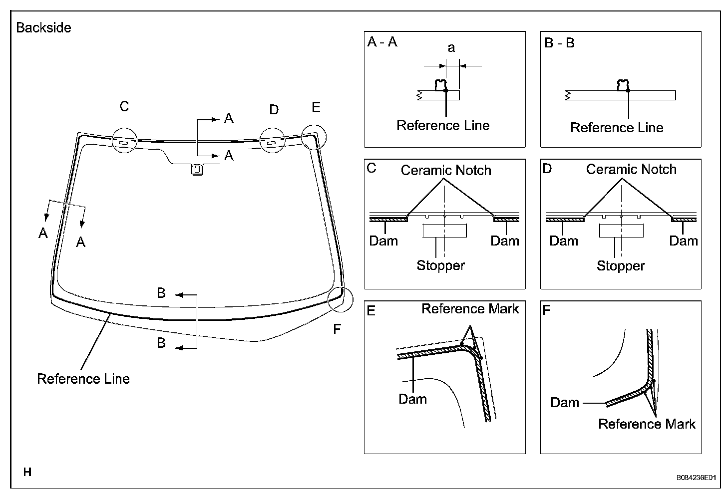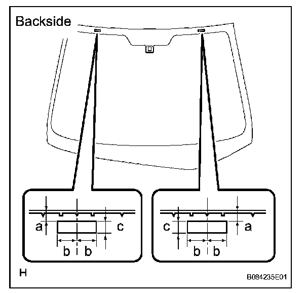 3. Place matchmarks on the glass and vehicle body on the locations indicated in the illustration.