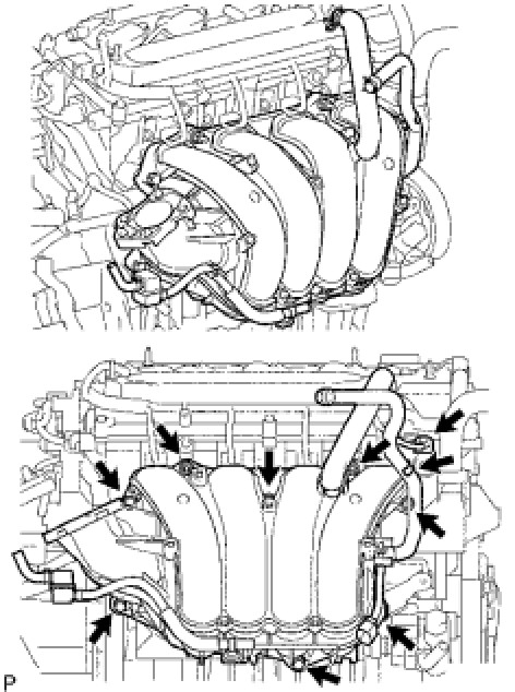 (b) Install the intake manifold with the 5 bolts and 2 nuts.