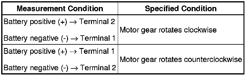 (1) Apply battery voltage to the motor connector according to the table below.
