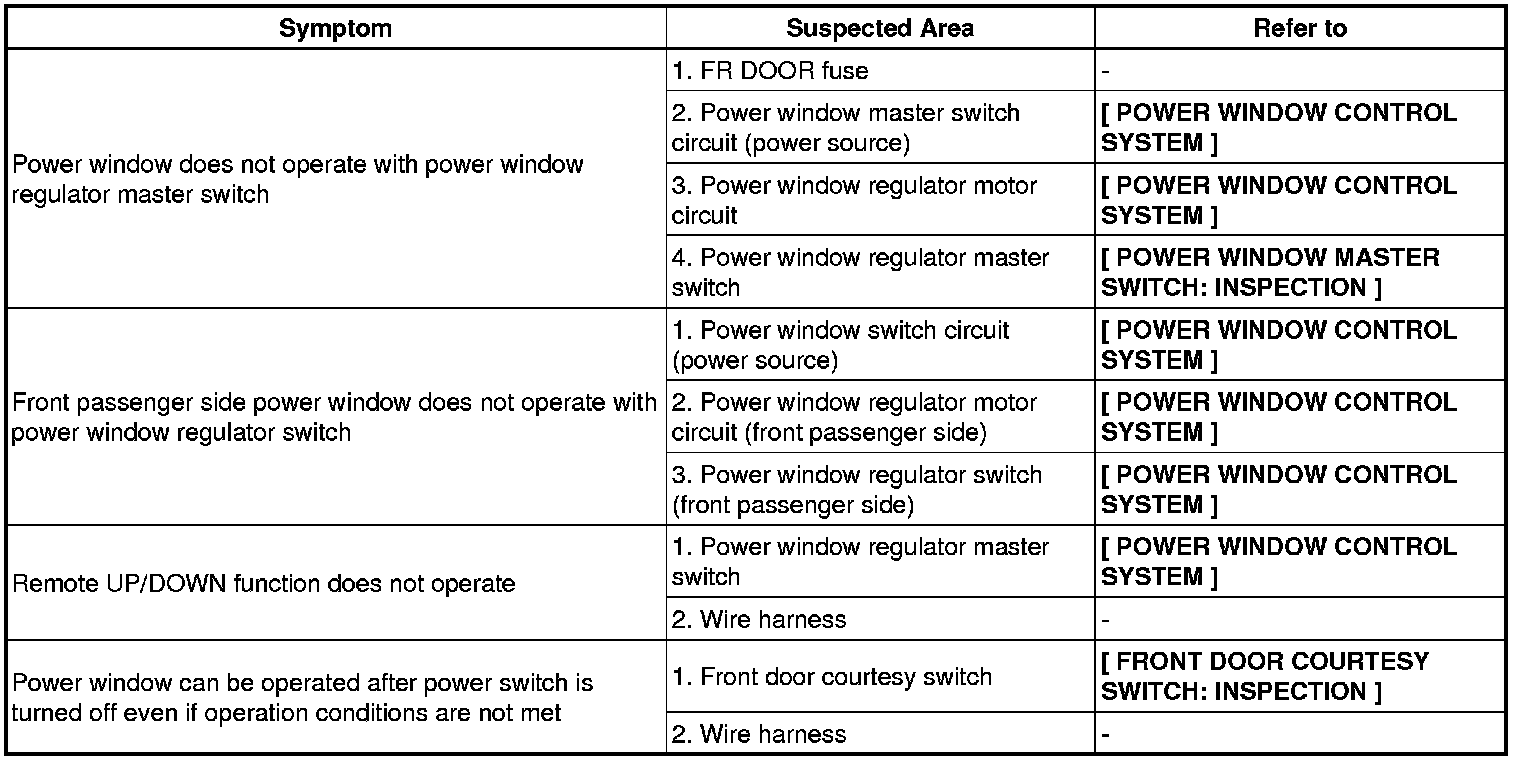 / WINDOWGLASS: POWER WINDOW CONTROL SYSTEM (w/o Jam Protection Function): PROBLEM SYMPTOMS TABLE