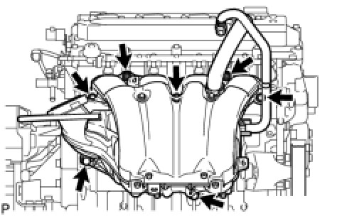 (d) Remove the 5 bolts, 2 nuts and intake manifold.