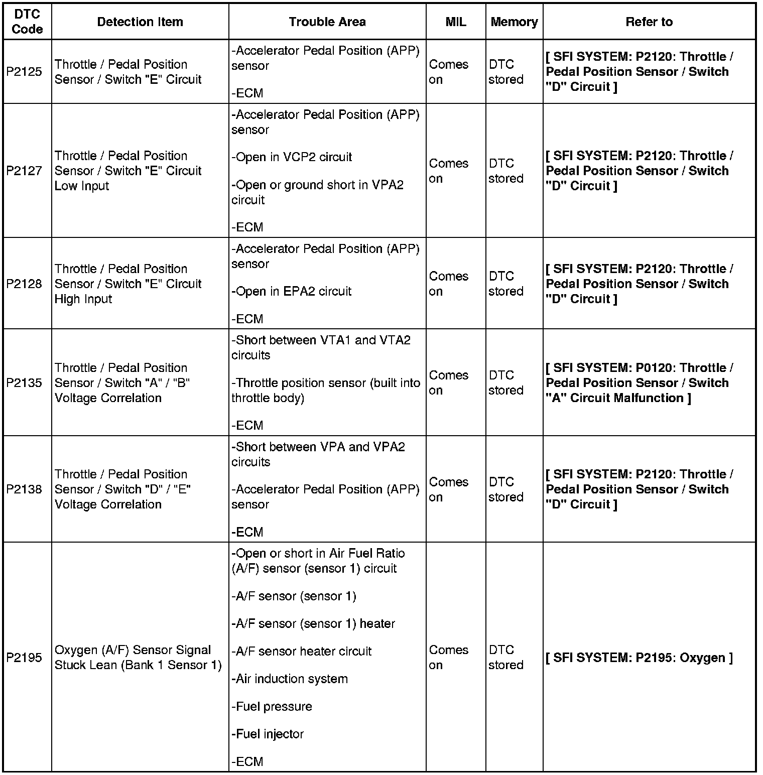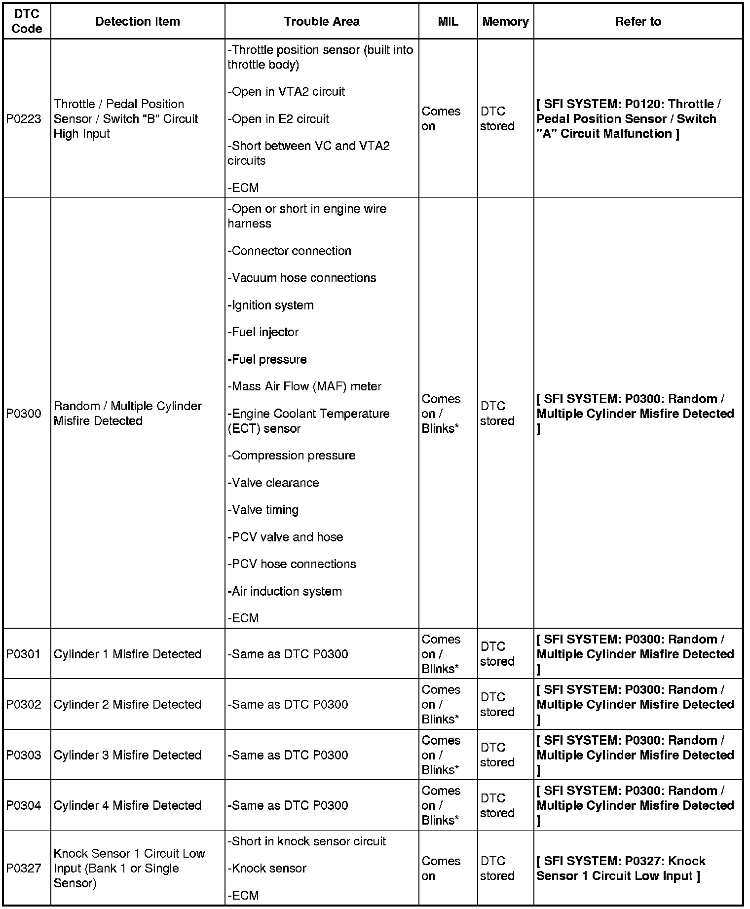 If any DTCs are displayed during a check mode DTC check, check the circuit for the DTCs listed in the table below. For details of each DTC, refer to the applicable Diagnostic Trouble Code Test.