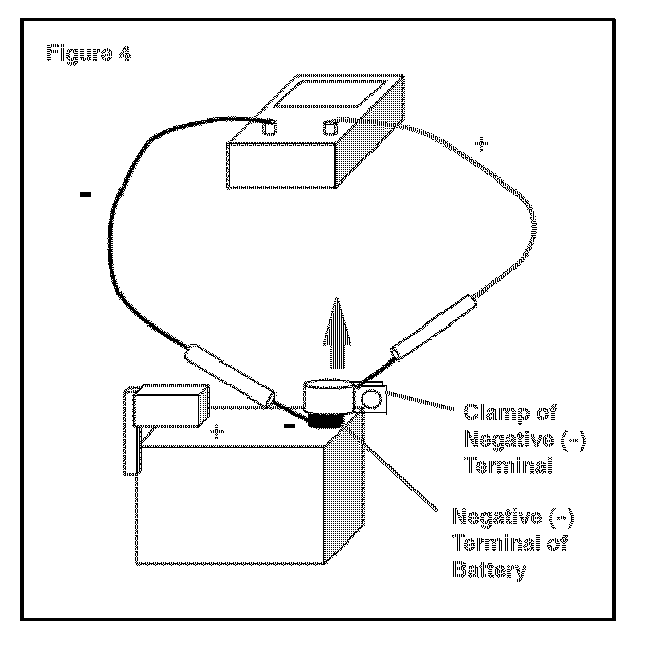 D. Place the negative (-) terminal of the multimeter to the negative (-) terminal post of the battery and the positive (+) terminal of the multimeter to the clamp of the negative (-) terminal battery cable (Figure 4).