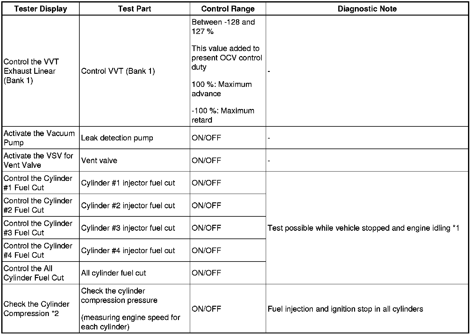 HINT: *2: When performing the Active Test item "Check the Cylinder Compression" and then cranking the engine, the ECM stops the fuel injection and ignition, and measures the engine speed for each cylinder.