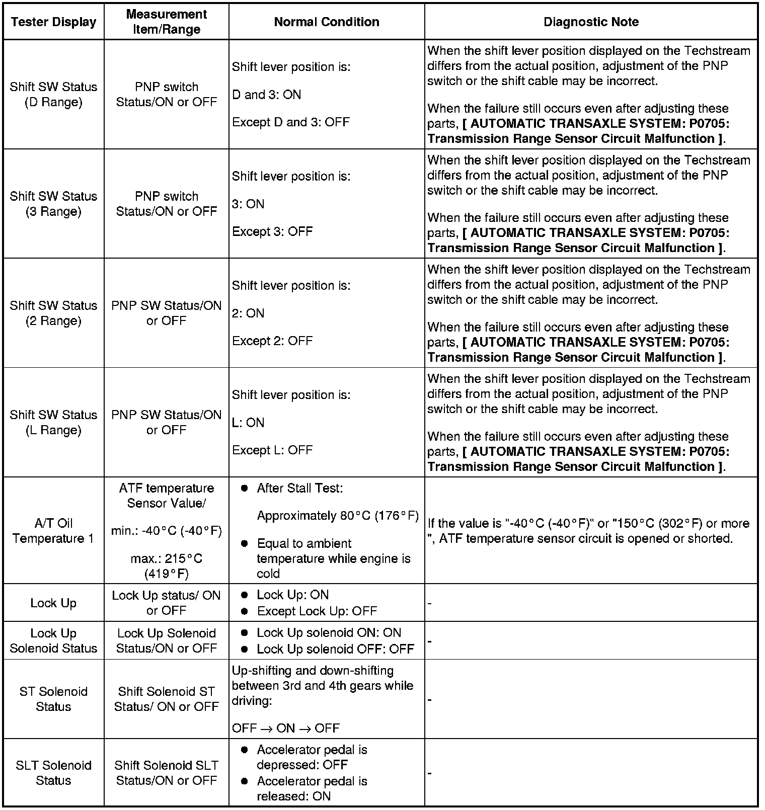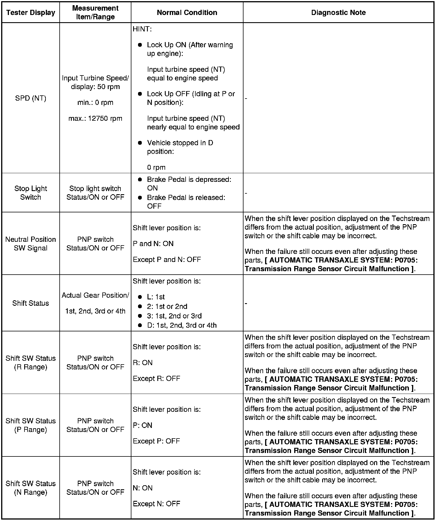 HINT: Using a Techstream to read the Data List allows the values or states of switches, sensors, actuators and other items to be read without removing any parts. This non-intrusive inspection can be very useful because intermittent conditions or signals may be discovered before parts or wiring is disturbed. Reading the Data List information early in troubleshooting is one way to save diagnostic time.