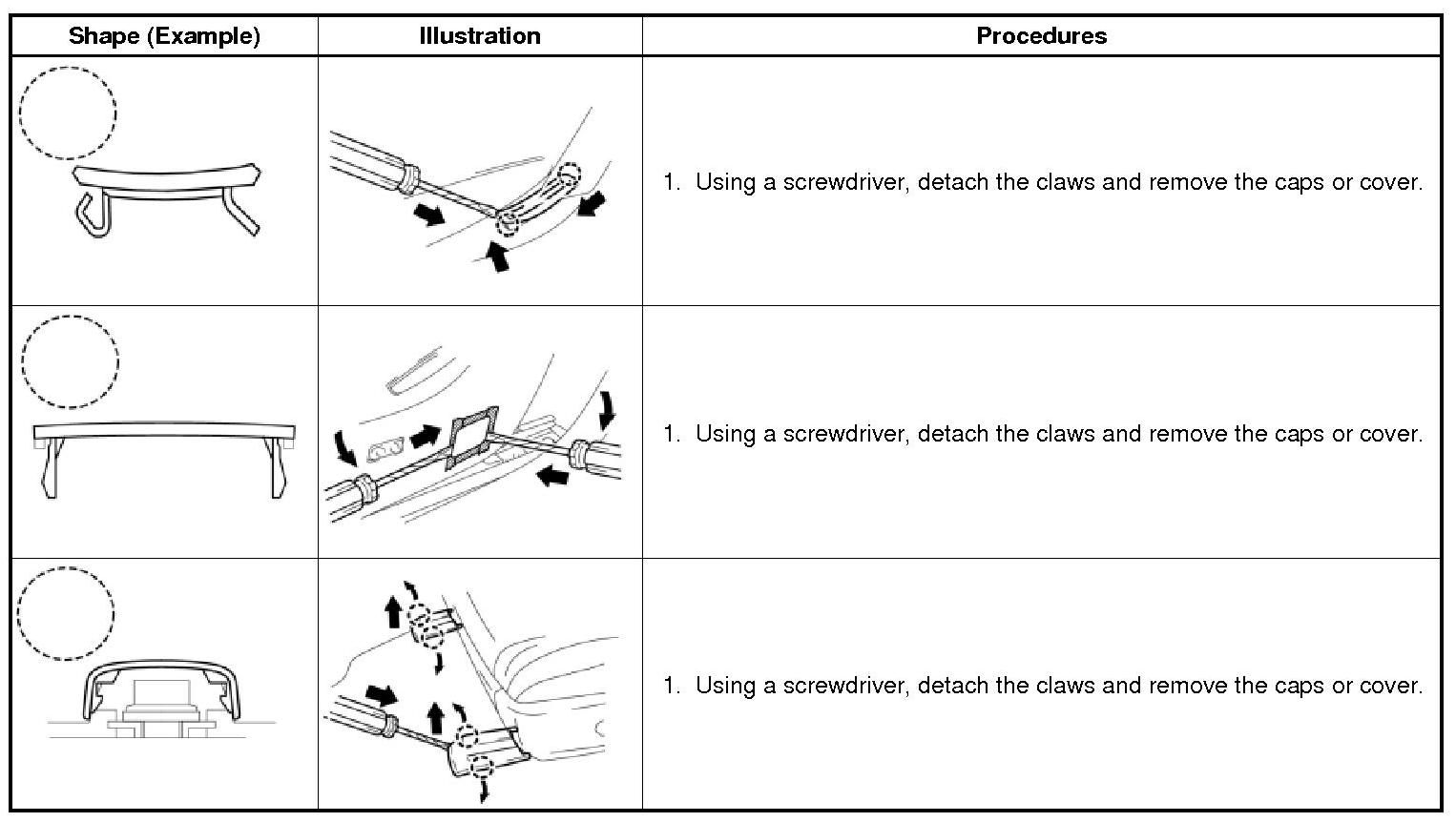 (1) The removal and installation methods of typical claws used for vehicle body parts are shown in the table below.