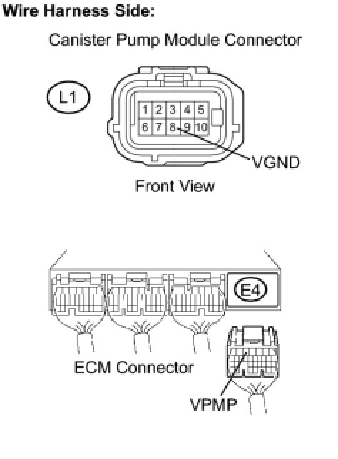 (c) Measure the resistance between the VPMP terminal of the ECM connector and the VGND terminal of the canister pump module connector.