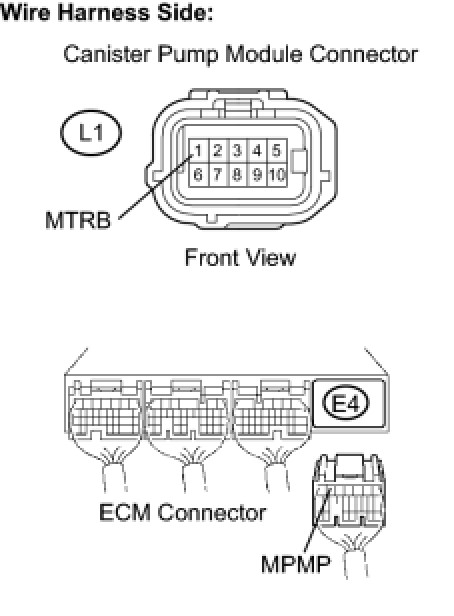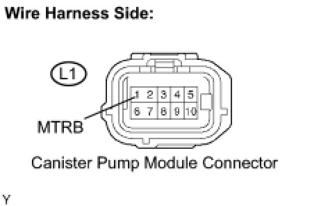 (d) Measure the resistance between the MPMP terminal of the ECM connector and the MTRB terminal of the canister pump module connector.