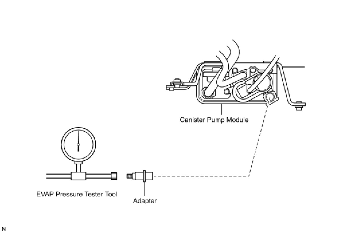 (b) Connect the EVAP pressure tester tool to the canister pump module with the adapter.