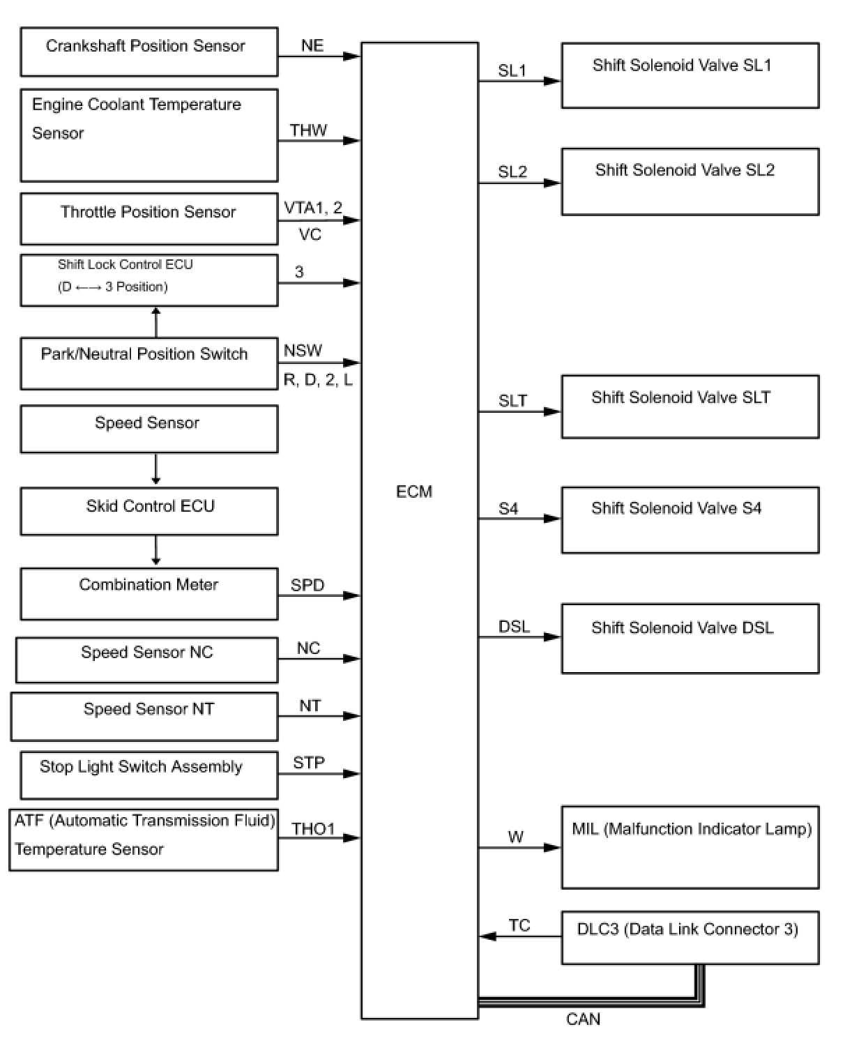 The configuration of the electronic control system in the U241E automatic transaxles is as shown in the following chart.