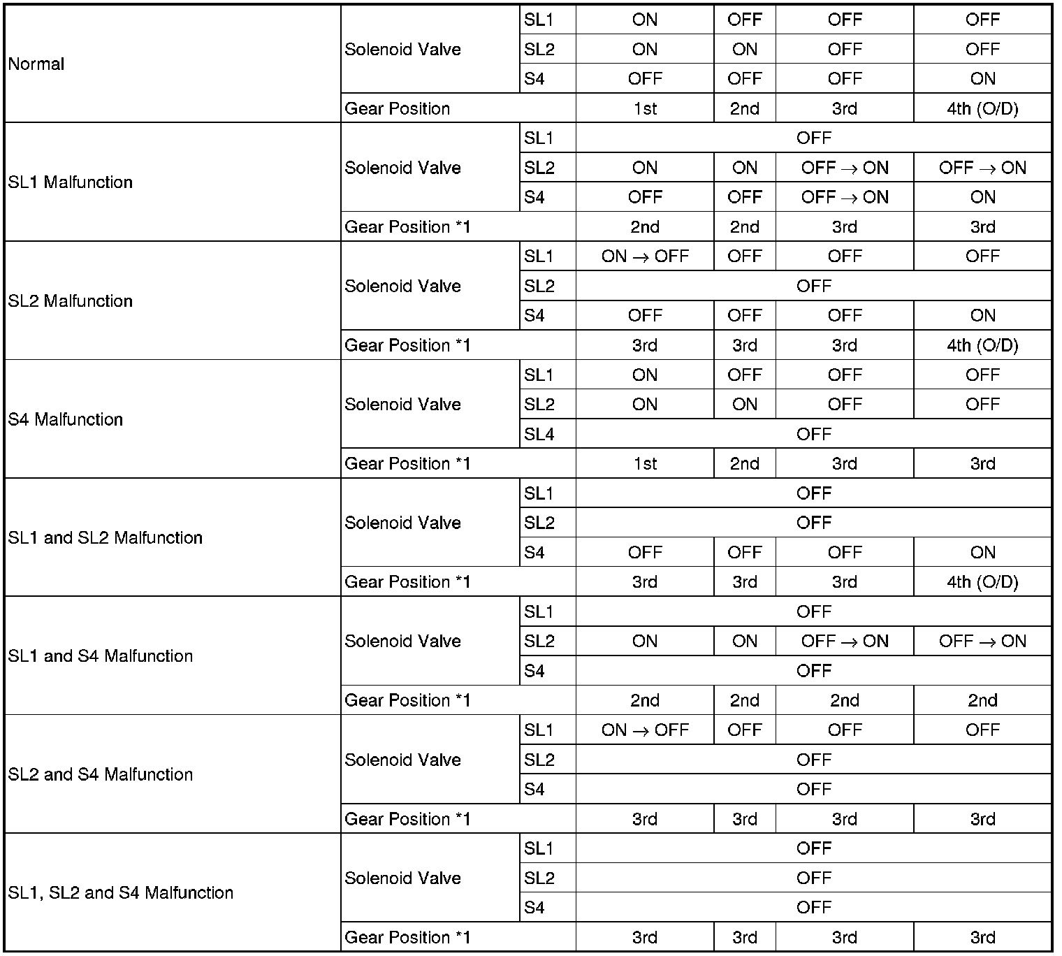 If either of the shift solenoid valve circuits develops an open or short, the ECM turns the other shift solenoid "ON" and "OFF" in order to shift into the gear positions shown in the table below.