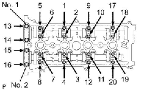Using several steps, uniformly tighten the 20 bearing cap bolts in the sequence shown in the illustration.