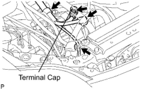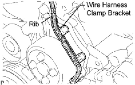 (b) Confirm that the wire harness of the crankshaft position sensor is secured to the wire harness clamp bracket through the back of the rib of the timing chain cover.