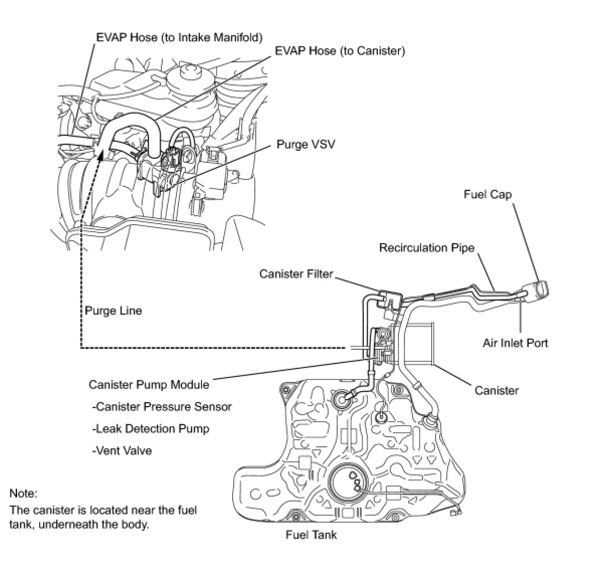 The leak detection pump creates negative pressure (vacuum) in the EVAP system and the pressure is measured. Finally, the ECM monitors for leaks from the EVAP system, and malfunctions in both the canister pump module and purge VSV, based on the EVAP pressure.