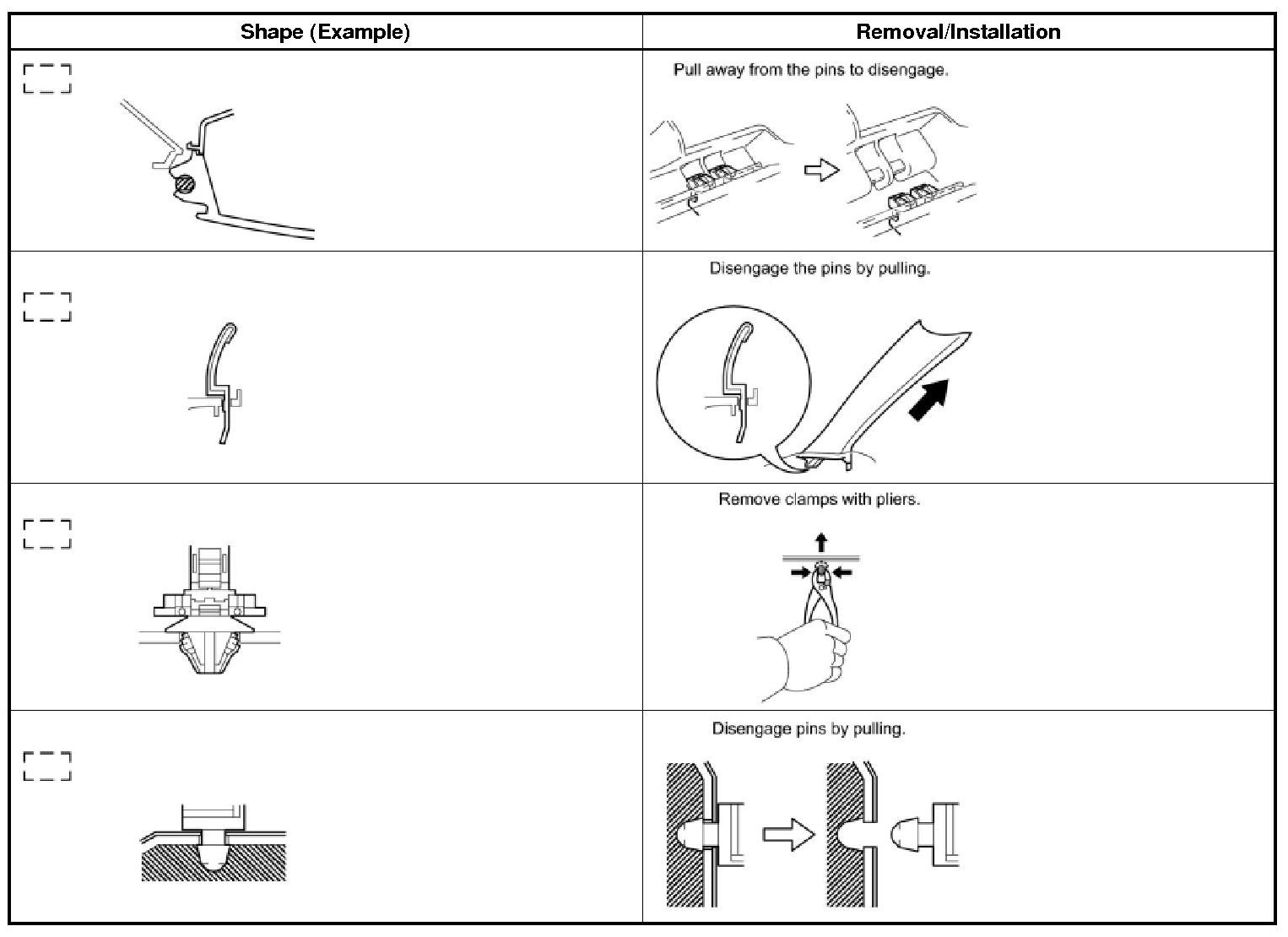 (1) The removal and installation methods of typical hinge, guide, clamp and pin used for vehicle body parts are shown in the table below.