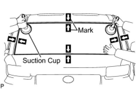 (1) Using suction cups, position the windshield glass so that the matchmarks are aligned, and press it in gently along the rim.