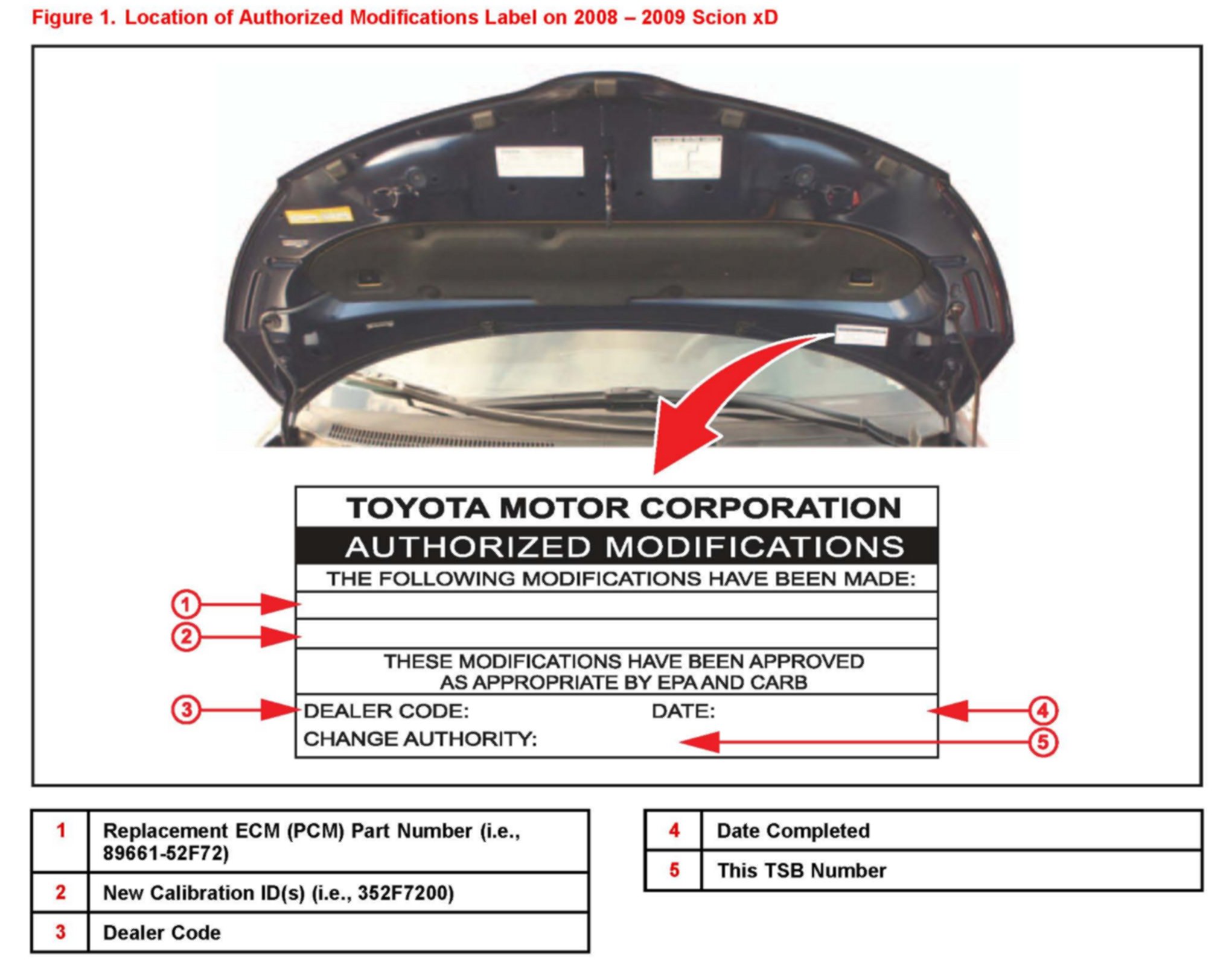 2. Check for the Authorized Modifications Label affixed to the vehicle in the location shown in Figure 1. Confirm if the ECM (PCM) calibration has been updated. If the calibration ID listed is NOT the latest ECM (PCM) calibration - go to step 3.