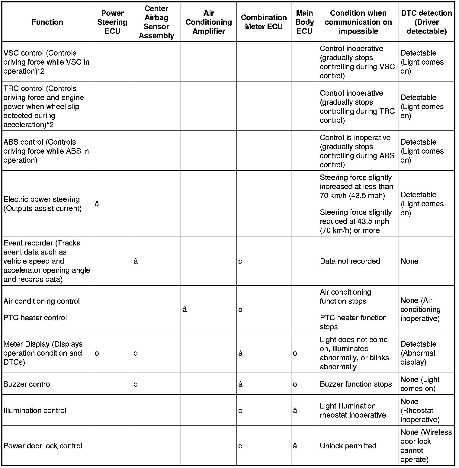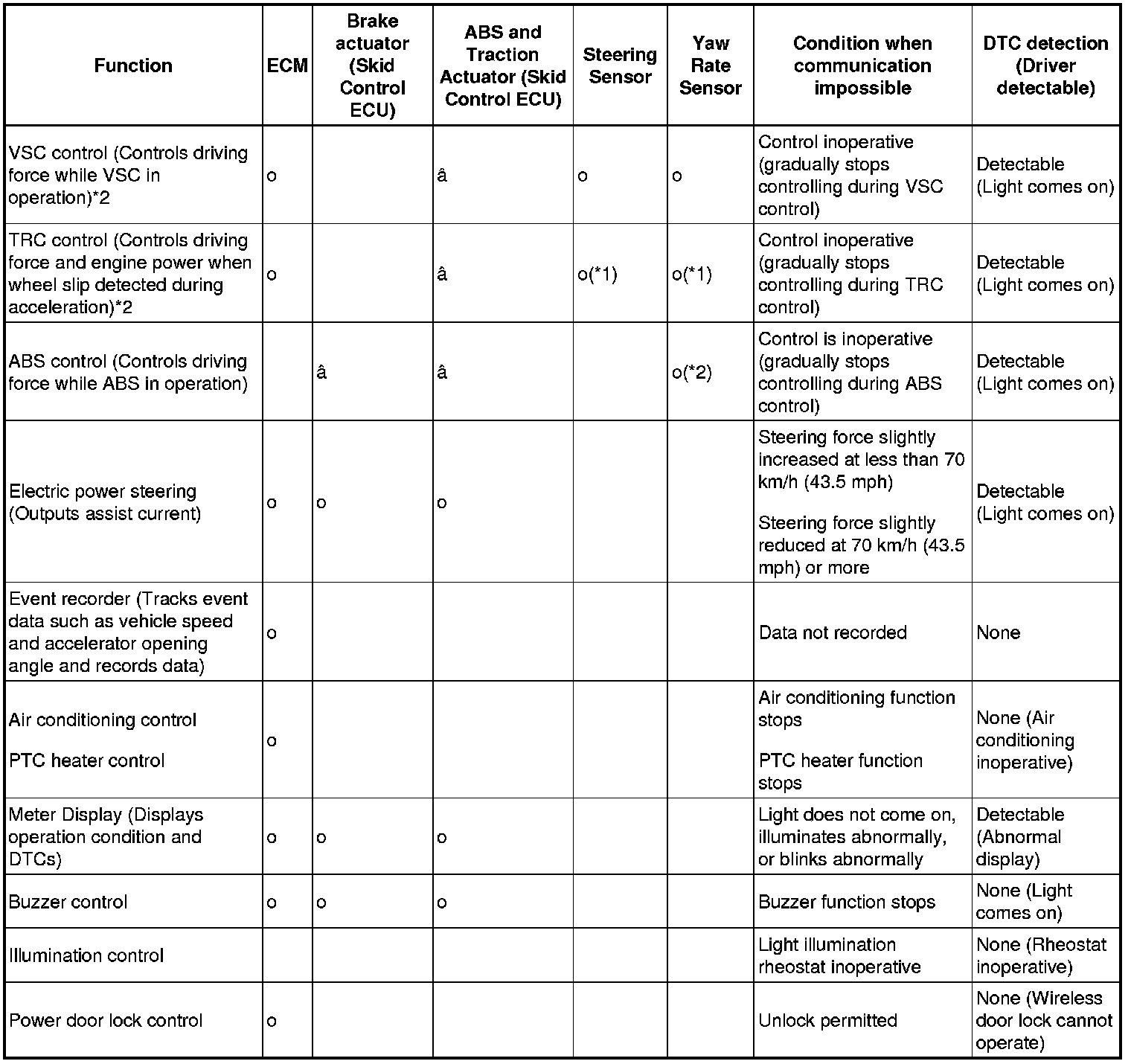 - *1: When CAN communication failures occur in the steering sensor and the yaw rate sensors, the operations of VSC and TRC are prohibited.