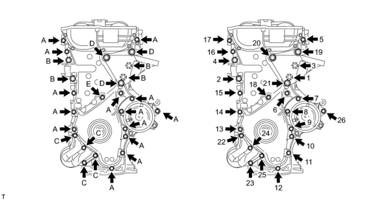 Install the timing chain cover with the 19 bolts as shown in the illustration.Bolt A and C - Torque: 26 Nm (260 kgf-cm, 19 ft-lbf)