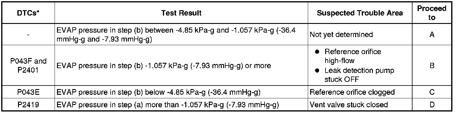 If the reference pressure difference between the first and second checks is greater than the specification, all the DTCs relating to the reference pressure (P043E, P043F, P2401, P2402 and P2419) are stored.