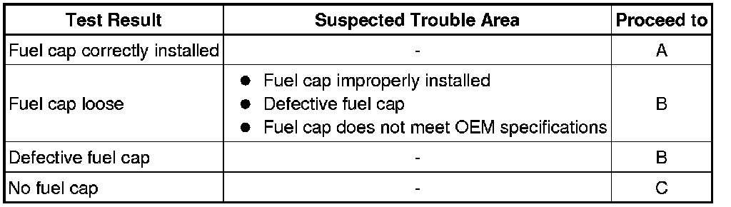 If any EVAP system DTCs are set, the malfunctioning area can be determined using the table below.