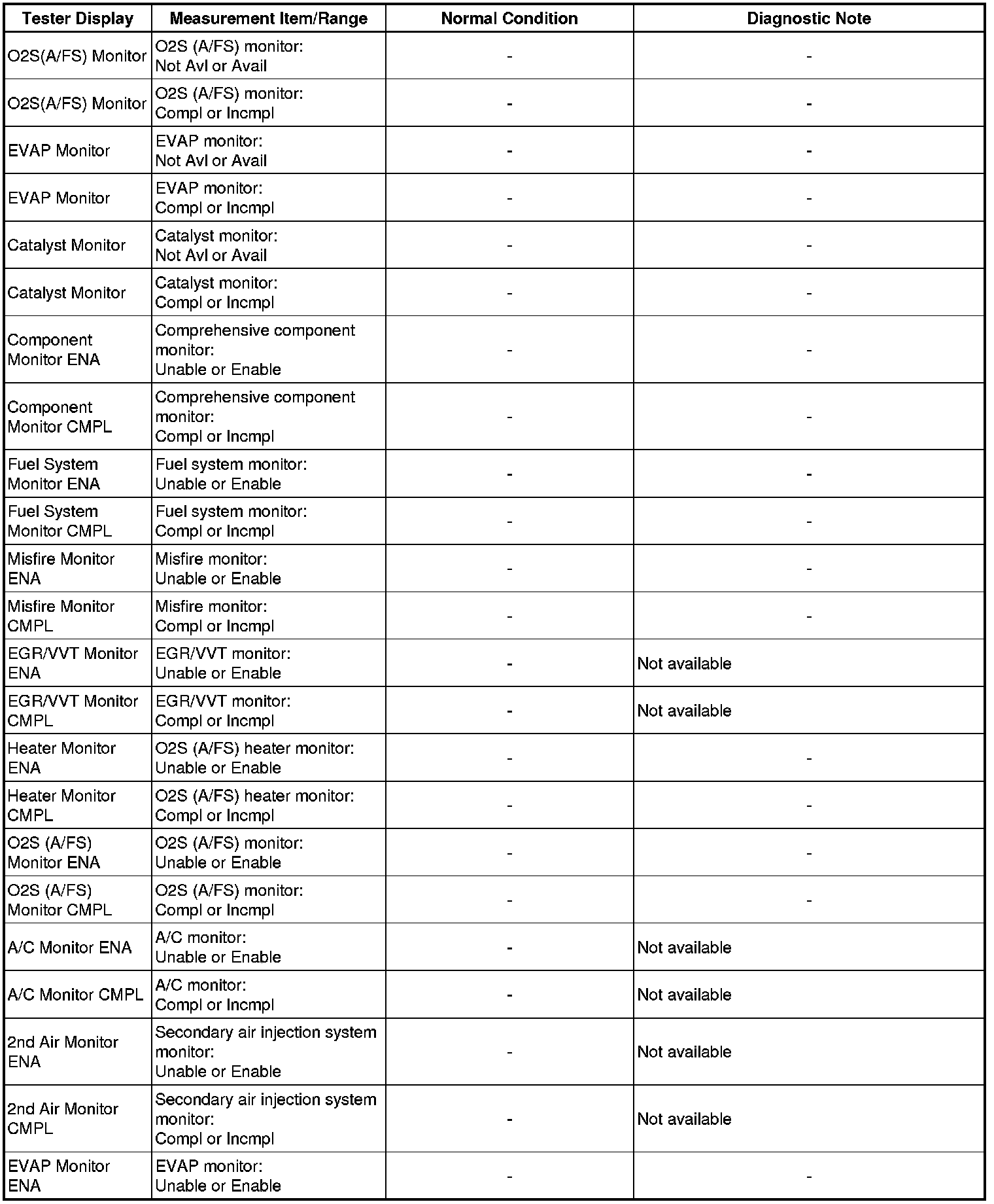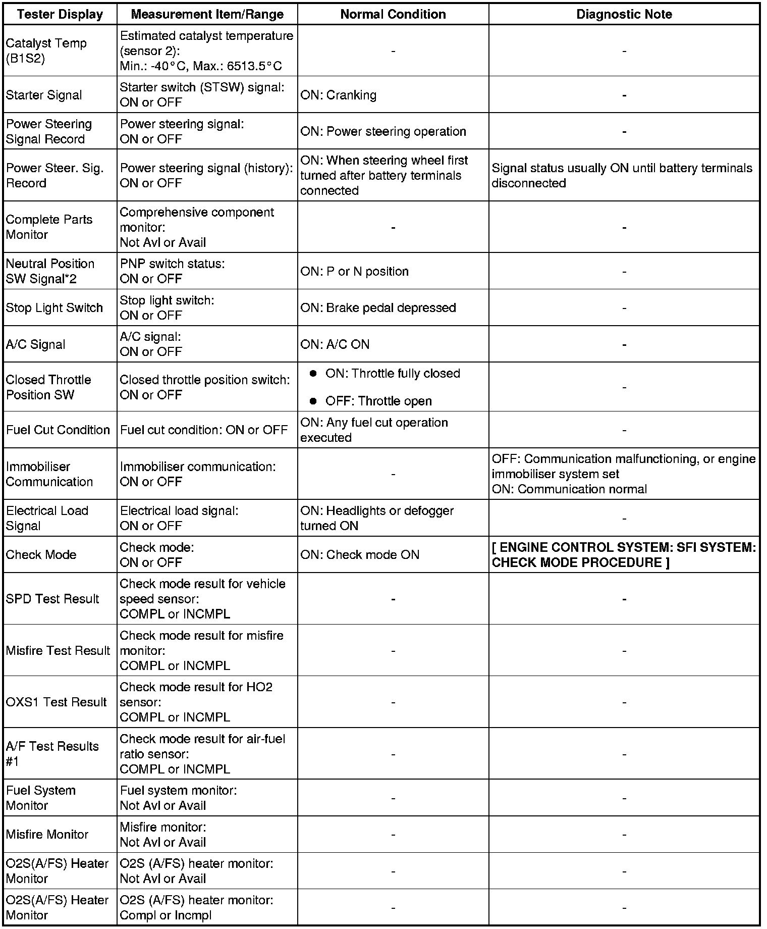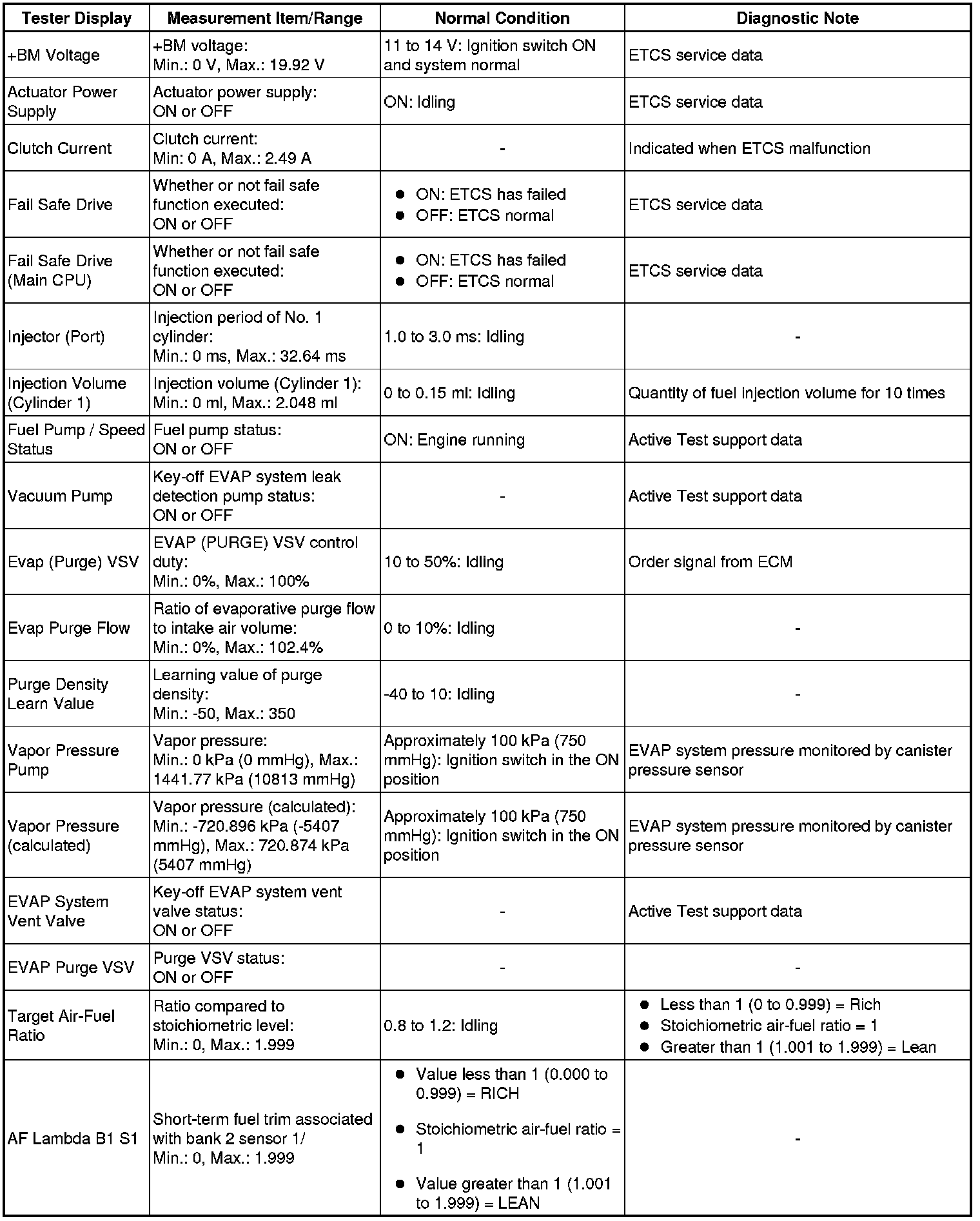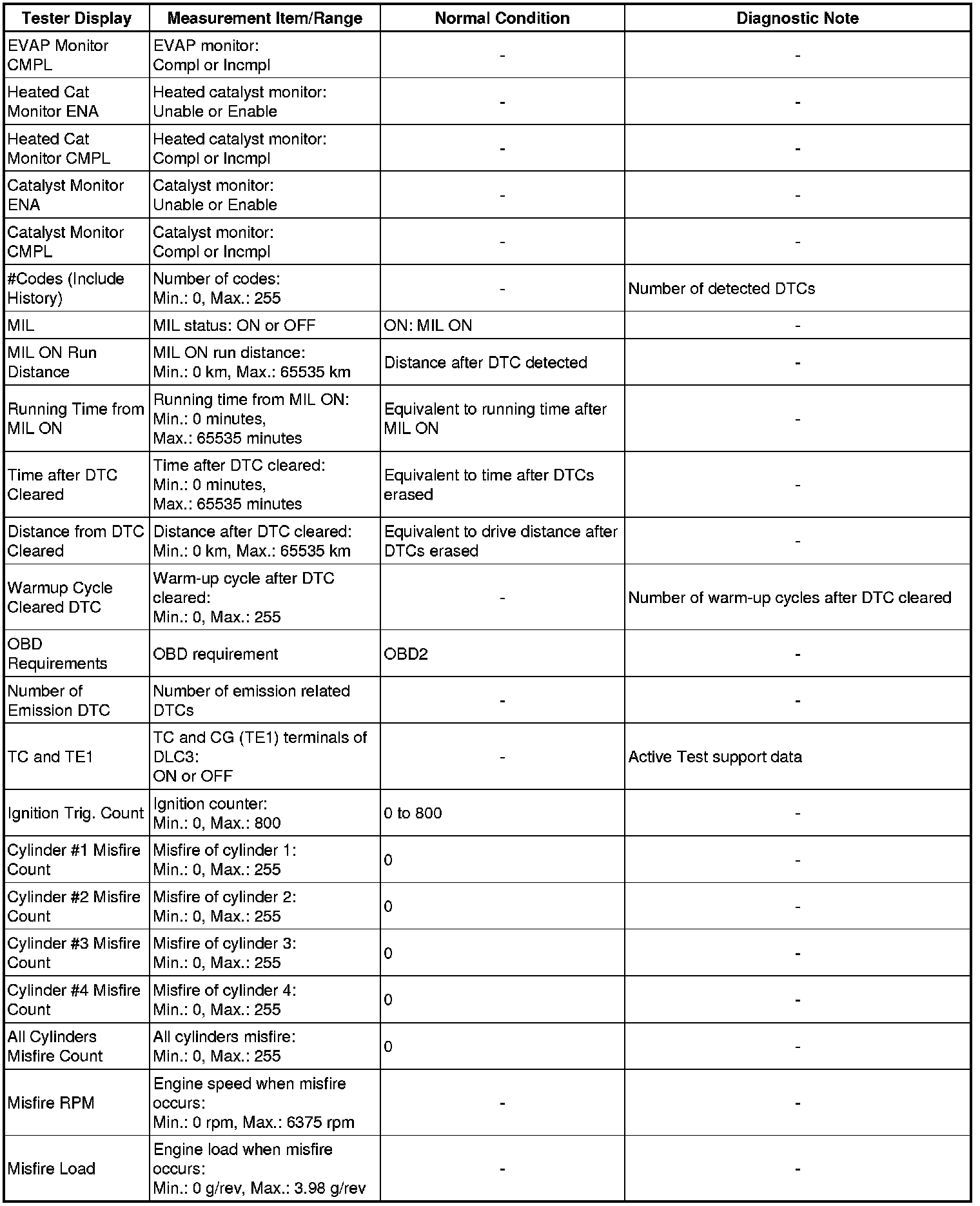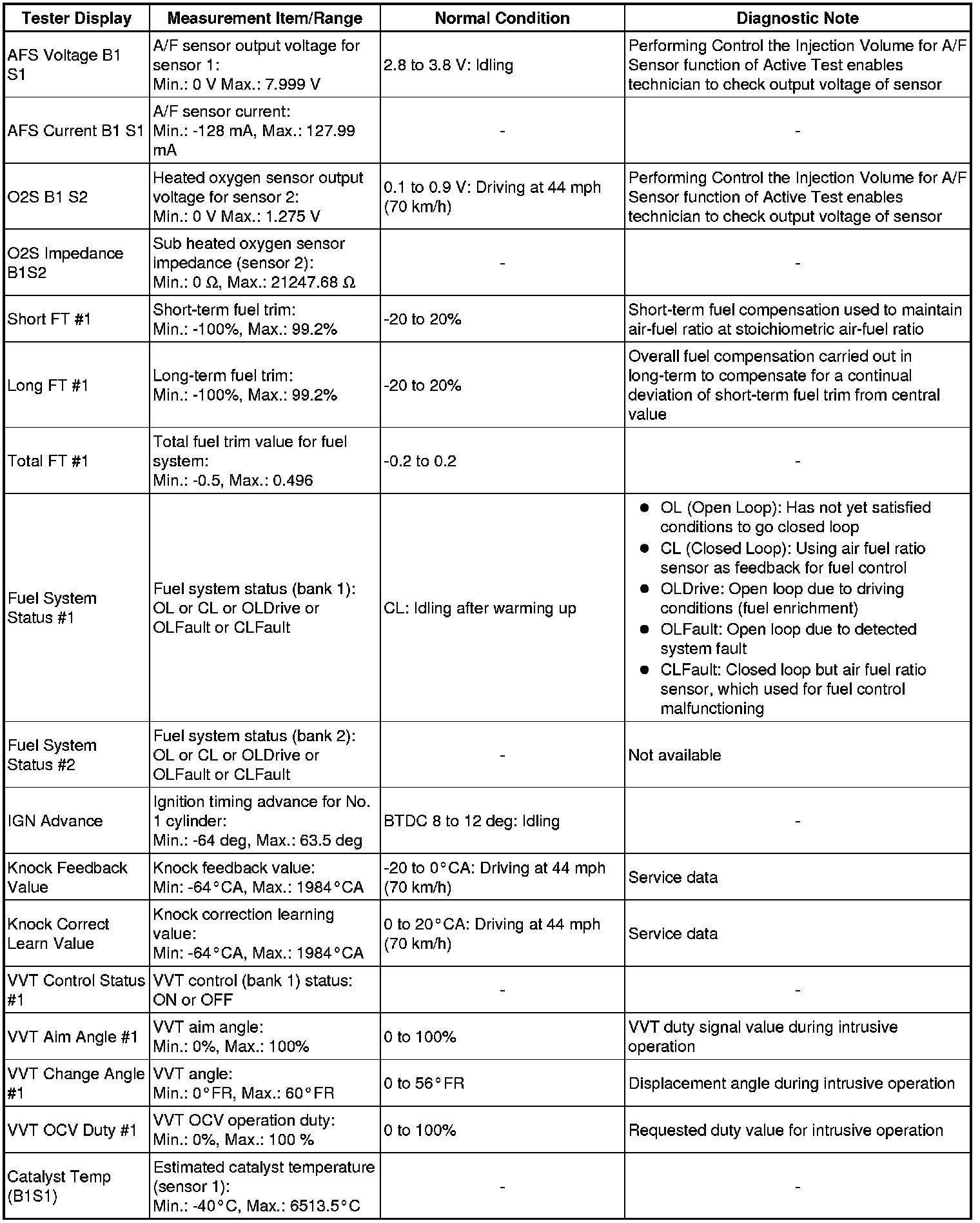 In the table below, the values listed under Normal Conditions are for reference only. Do not depend solely on these values when determining whether or not a part is faulty.