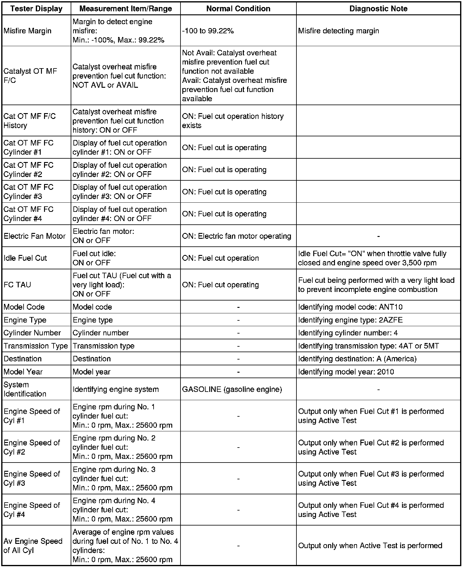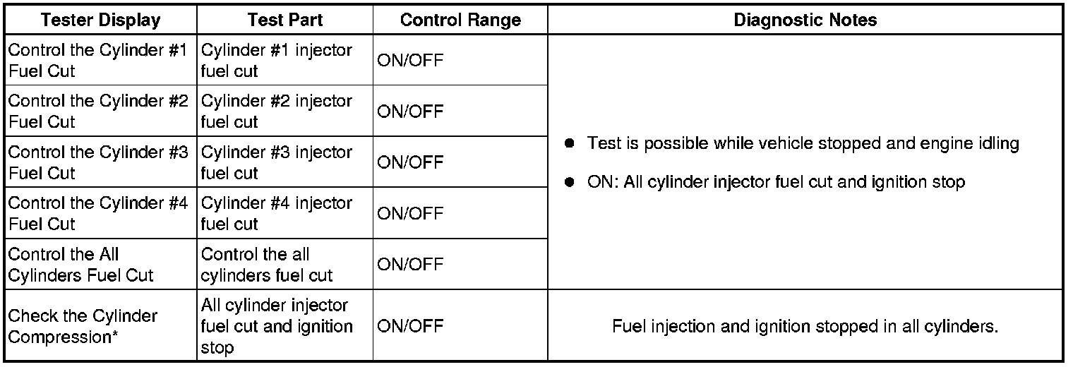 *: When cranking the engine, each cylinder measures the engine speed. In this Active Test, the fuel and ignition of all cylinders are cut, and cranking occurs for approximately 10 seconds. Then, each cylinder measures the engine speed. If a cylinder's engine speed is higher than the others, that cylinder's compression pressure is compared to the others, and is determined whether it is low or not.