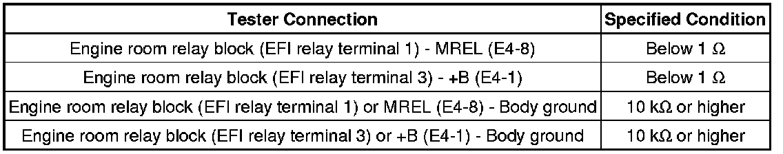 When the ignition switch is turned to the ON position, the battery voltage is applied to terminal IGSW of the ECM. The ECM MREL output signal causes a current to flow to the coil, closing the contacts of the EFI relay and supplying power to terminal +B of the ECM.