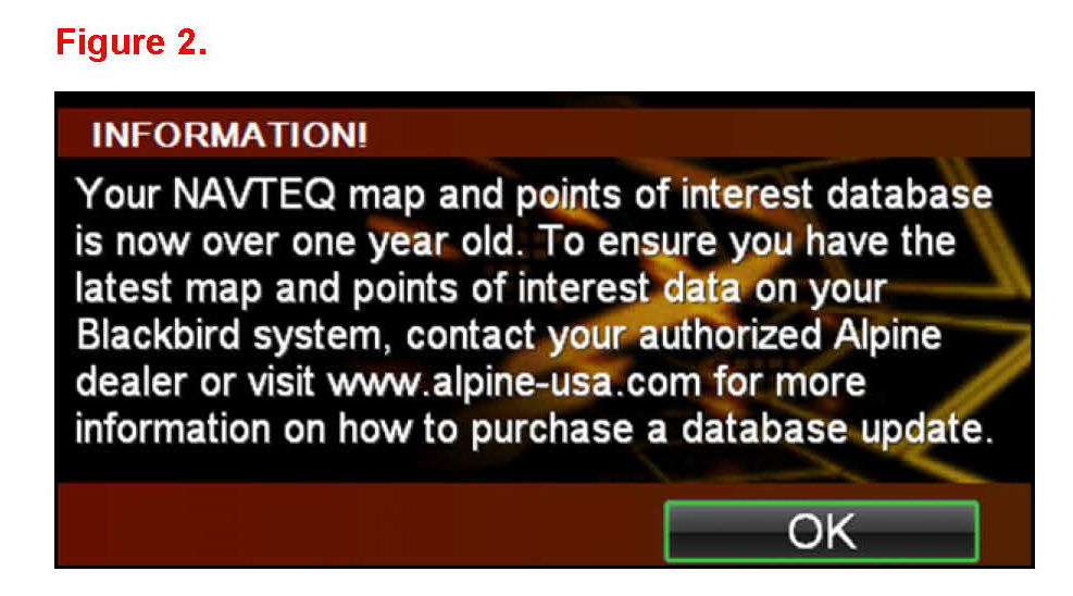 Some vehicles equipped with the Post Production Option (PPO) / Dealer Installed Option (DIO) accessory Alpine Premium Audio and the Alpine add-on navigation module may exhibit a map database update notification that occurs at start up while displaying the navigation screen. The notification screen will display after each start up if the software update is not uploaded.