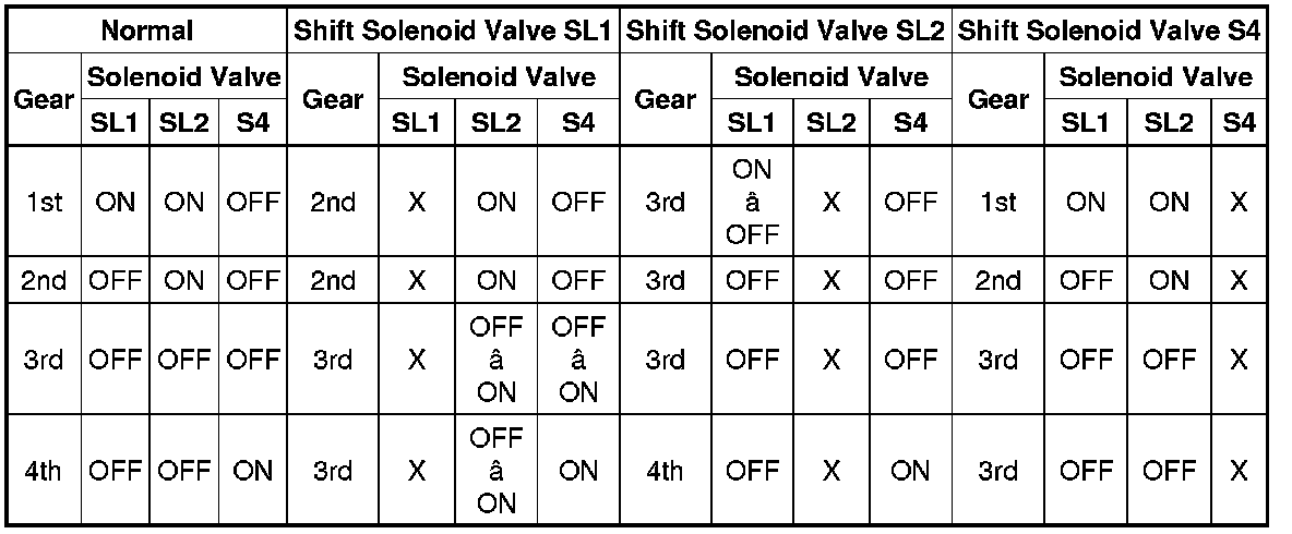 If any of the shift solenoid valve circuits develops an open or short, the ECM turns the other shift solenoid "ON" and "OFF" in order to shift into the gear positions shown in the table below.