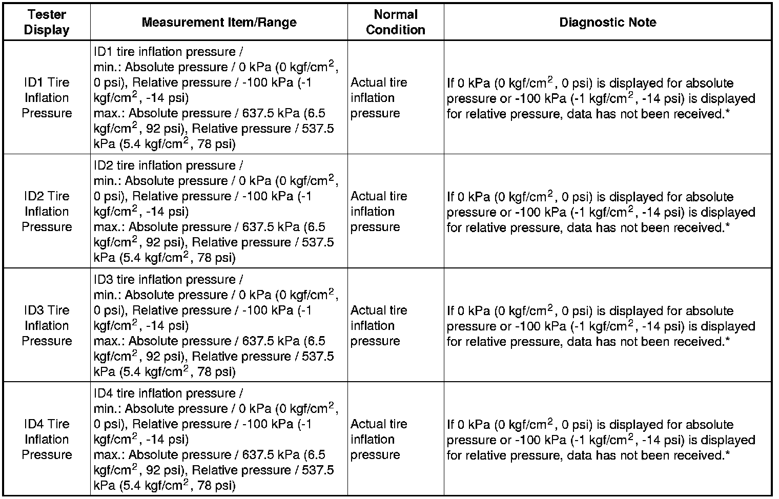 * The initialization is complete when the Data List "ID Tire Inflation Pressure" display shows the correct pressures.