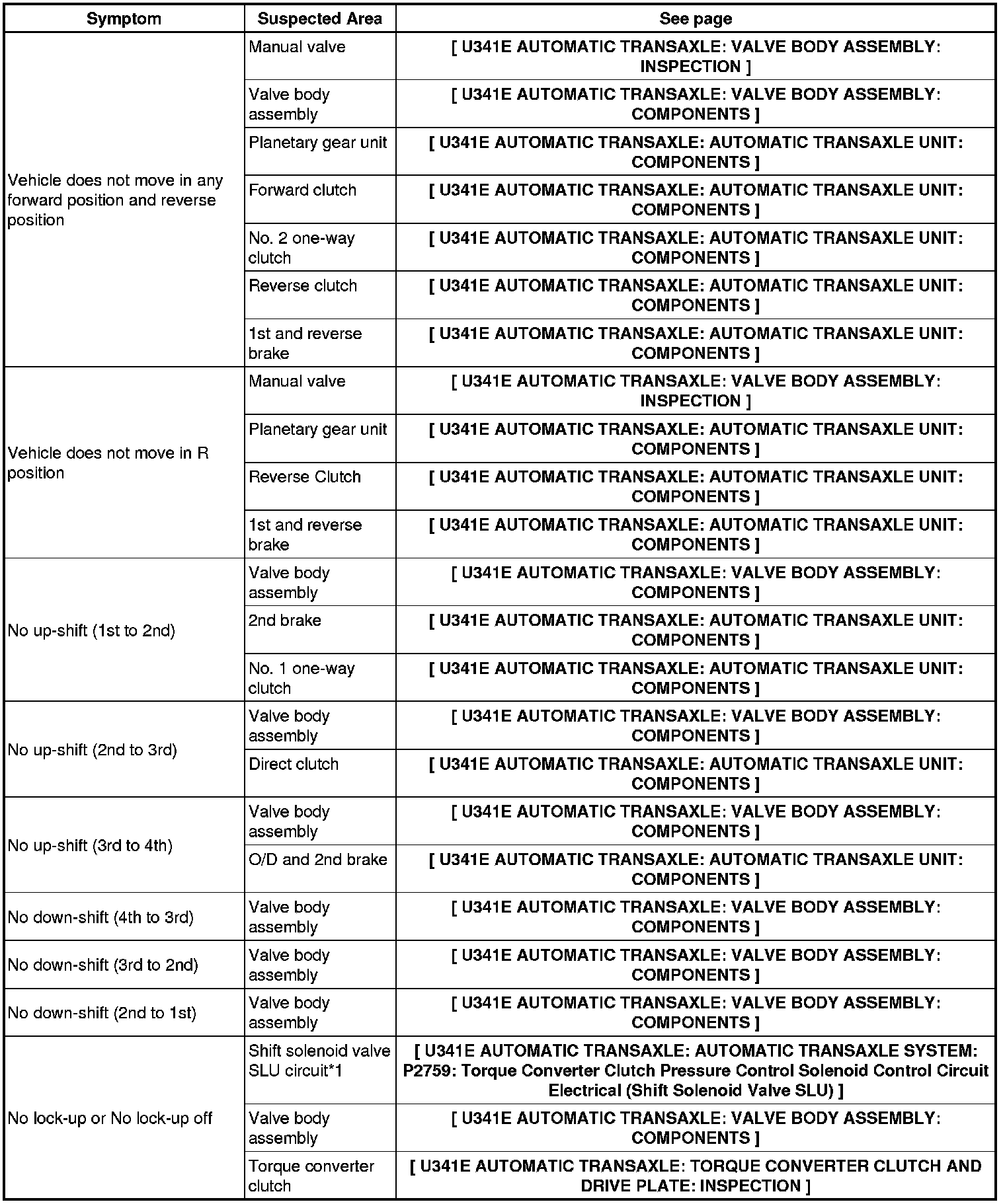 U341E AUTOMATIC TRANSAXLE: AUTOMATIC TRANSAXLE SYSTEM: PROBLEM SYMPTOMS TABLE