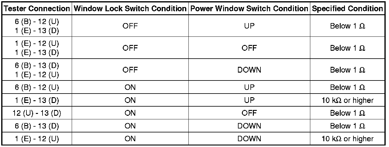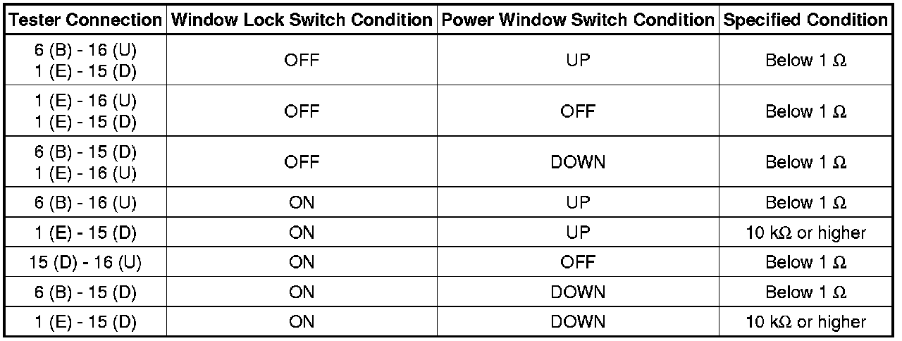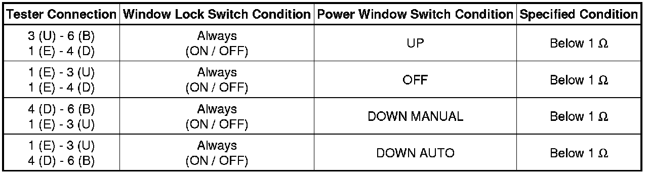 (1) If the result is not as specified, replace the power window master switch.