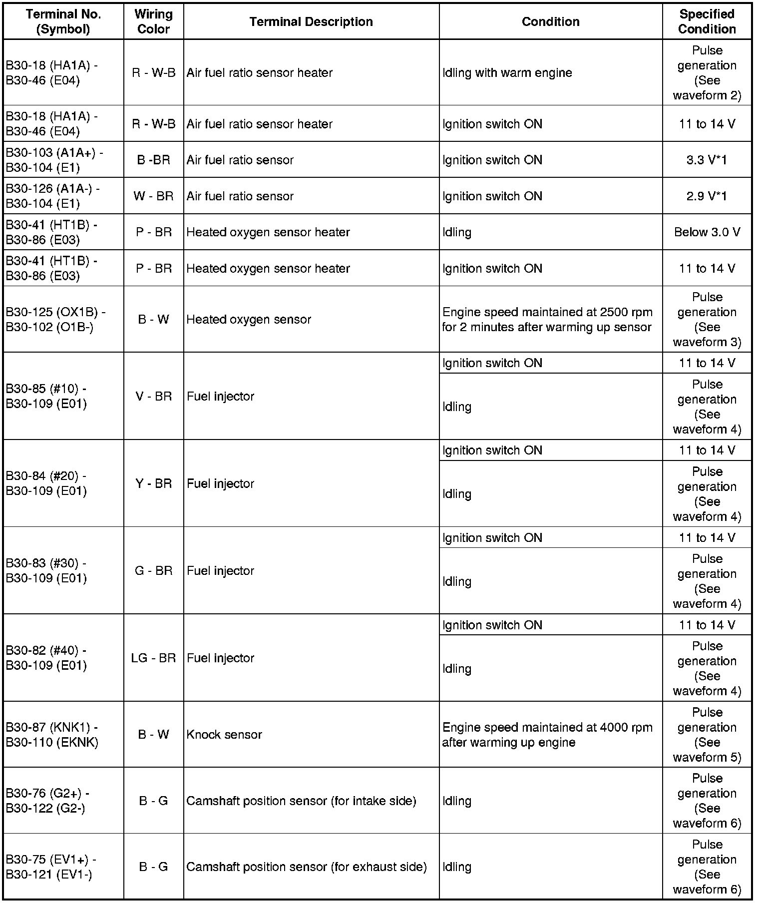 The standard voltage between each pair of ECM terminals is shown in the table below. The appropriate conditions for checking each pair of terminals are also indicated. The result of checks should be compared with the standard voltage for that pair of terminals, displayed in the "Specified Condition" column. The illustration above can be used as a reference to identify the ECM terminal locations.