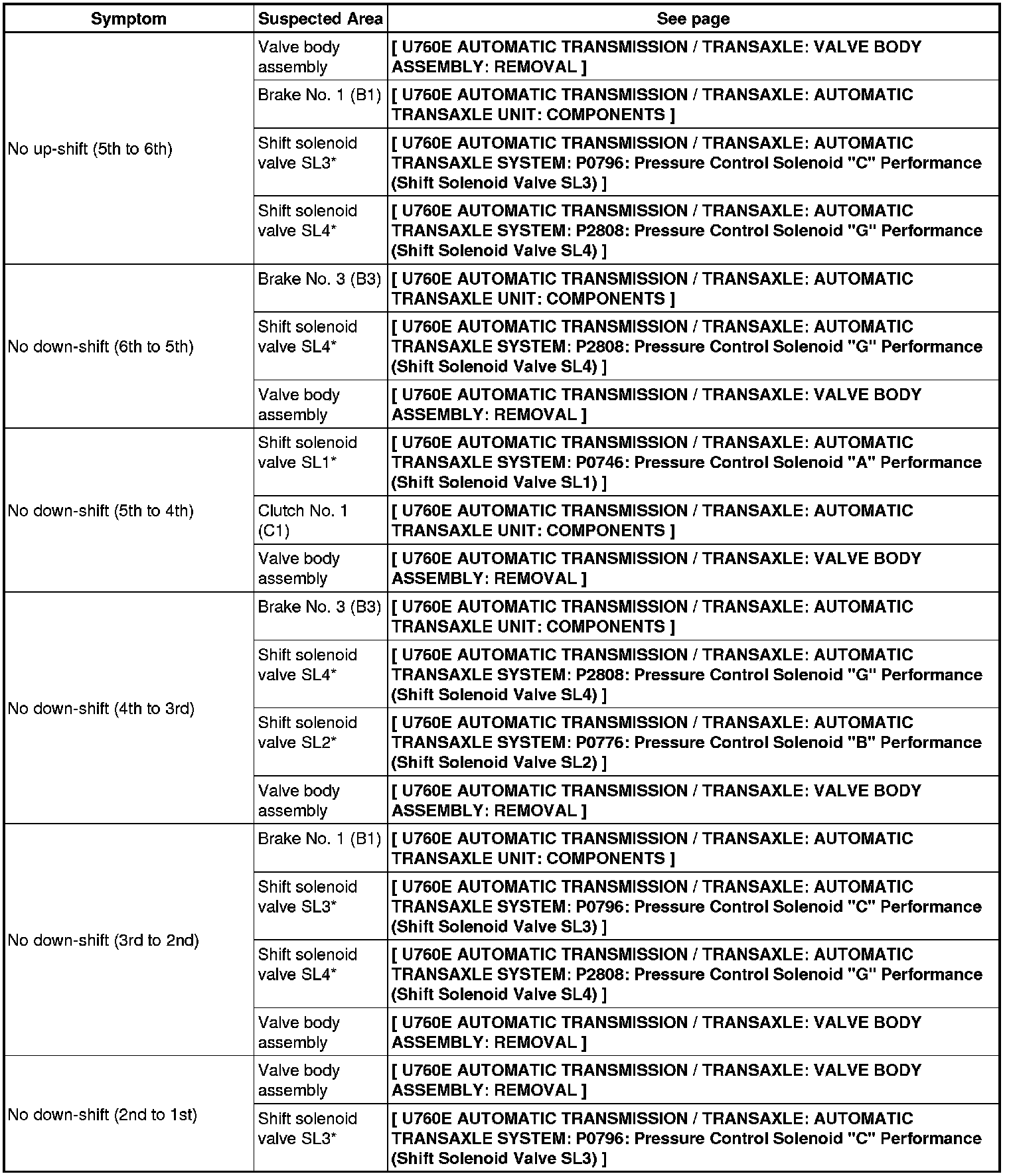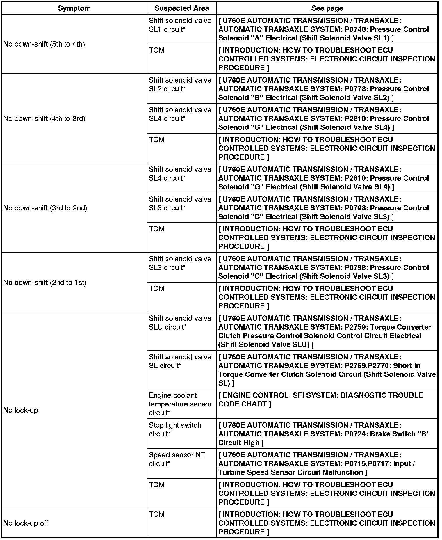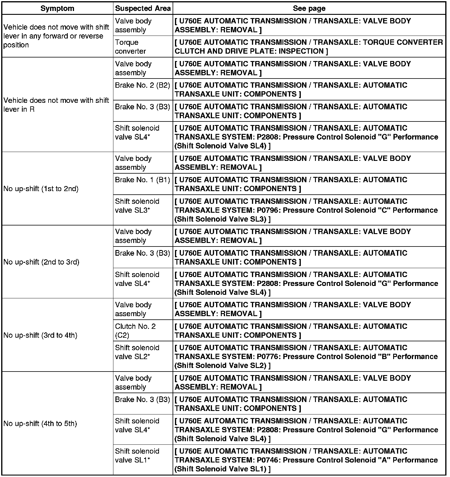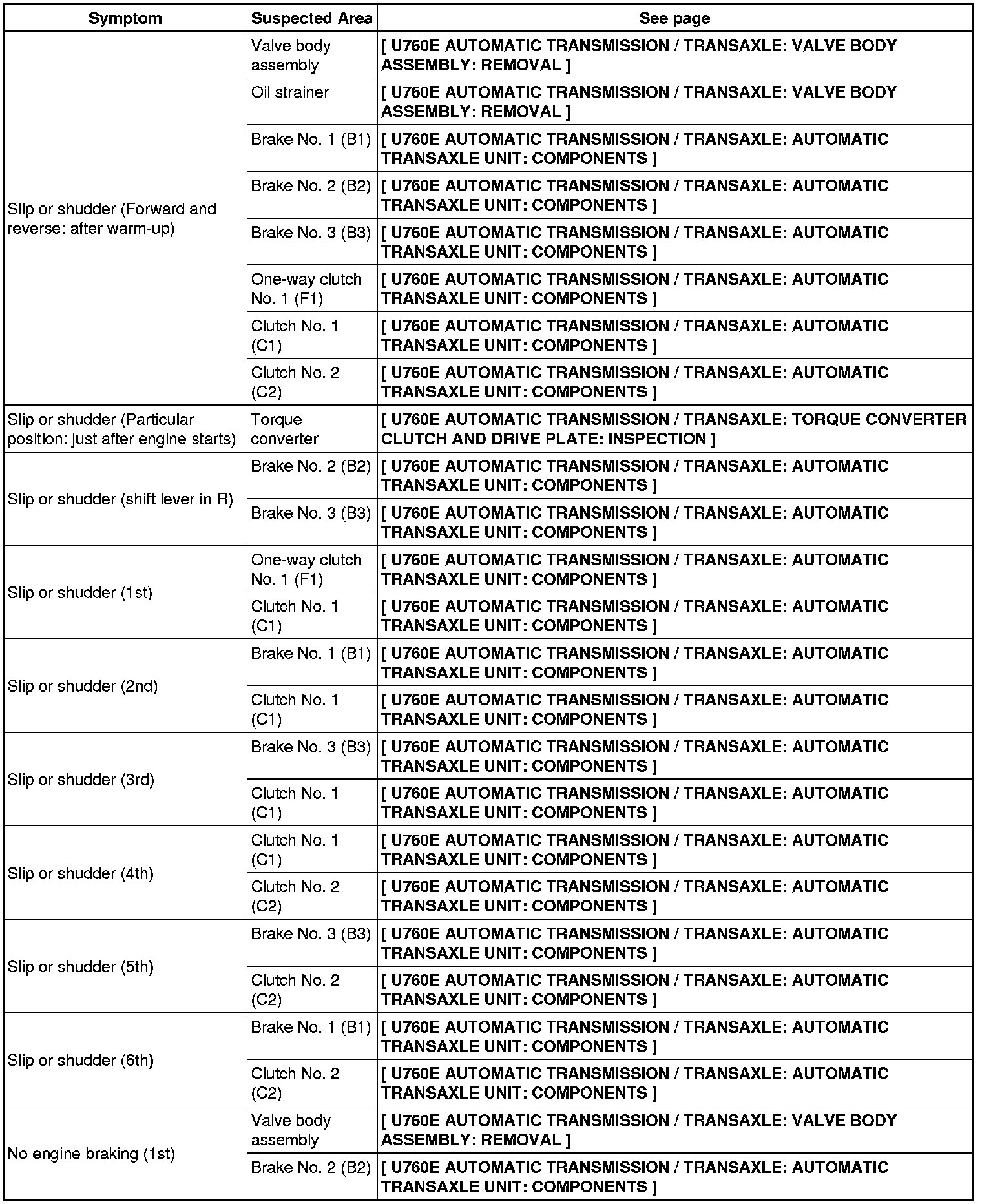 U760E AUTOMATIC TRANSMISSION / TRANSAXLE: AUTOMATIC TRANSAXLE SYSTEM: PROBLEM SYMPTOMS TABLE