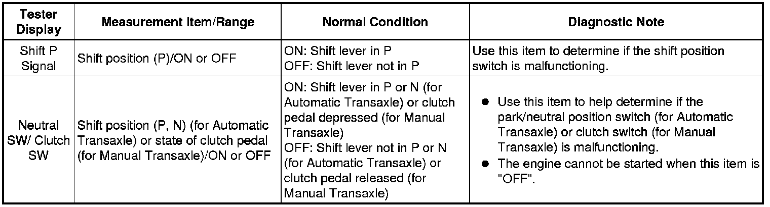 B -- READ VALUE USING TECHSTREAM (SHIFT P SIGNAL, NEUTRAL SW/ CLUTCH SW, SHIFT POSITION P OR N)