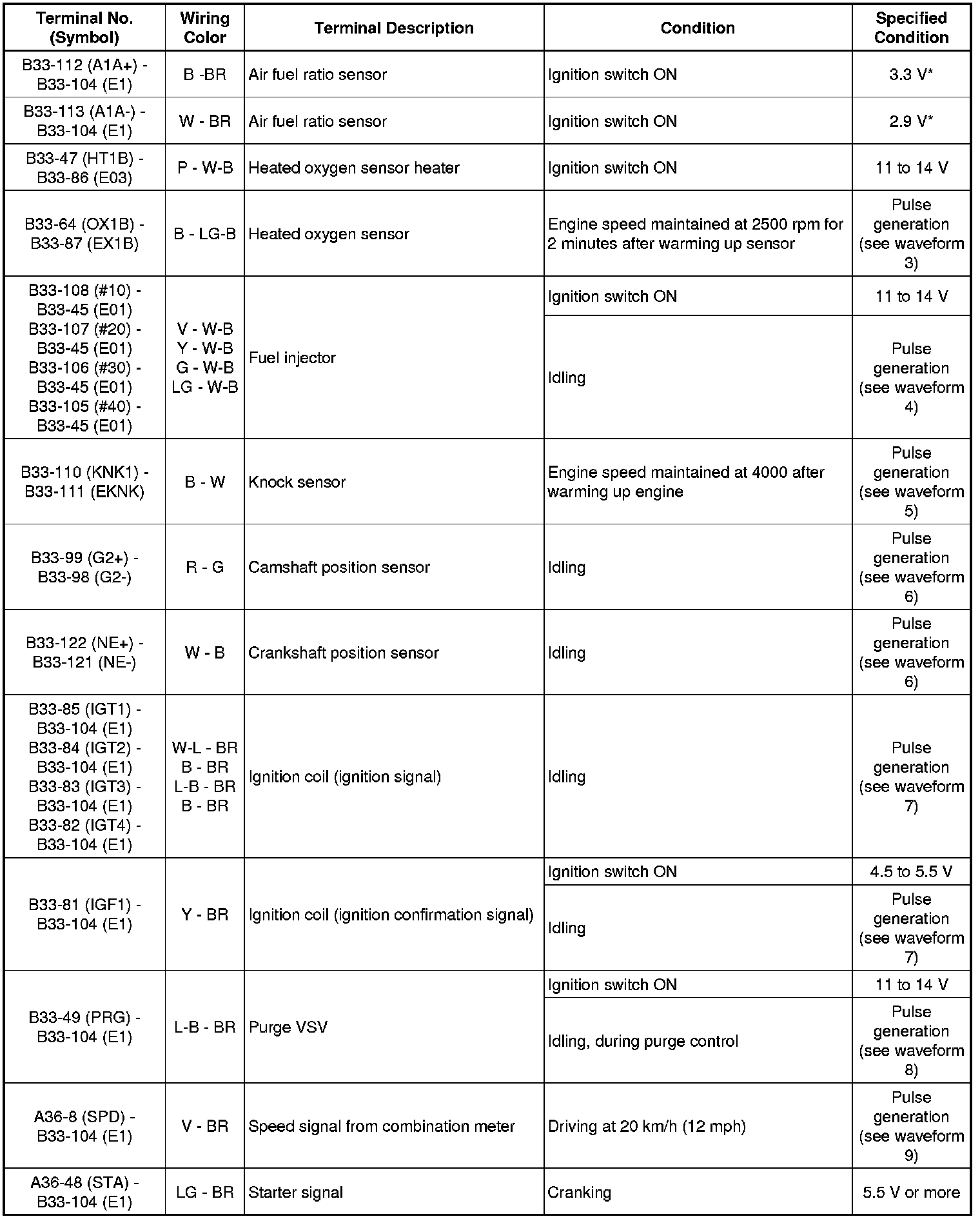 The standard normal voltage between each pair of ECM terminals is shown in the table below. The appropriate conditions for checking each pair of terminals are also indicated. The result of checks should be compared with the standard normal voltage for that pair of terminals, displayed in the Specified Condition column. The illustration above can be used as a reference to identify the ECM terminal locations.