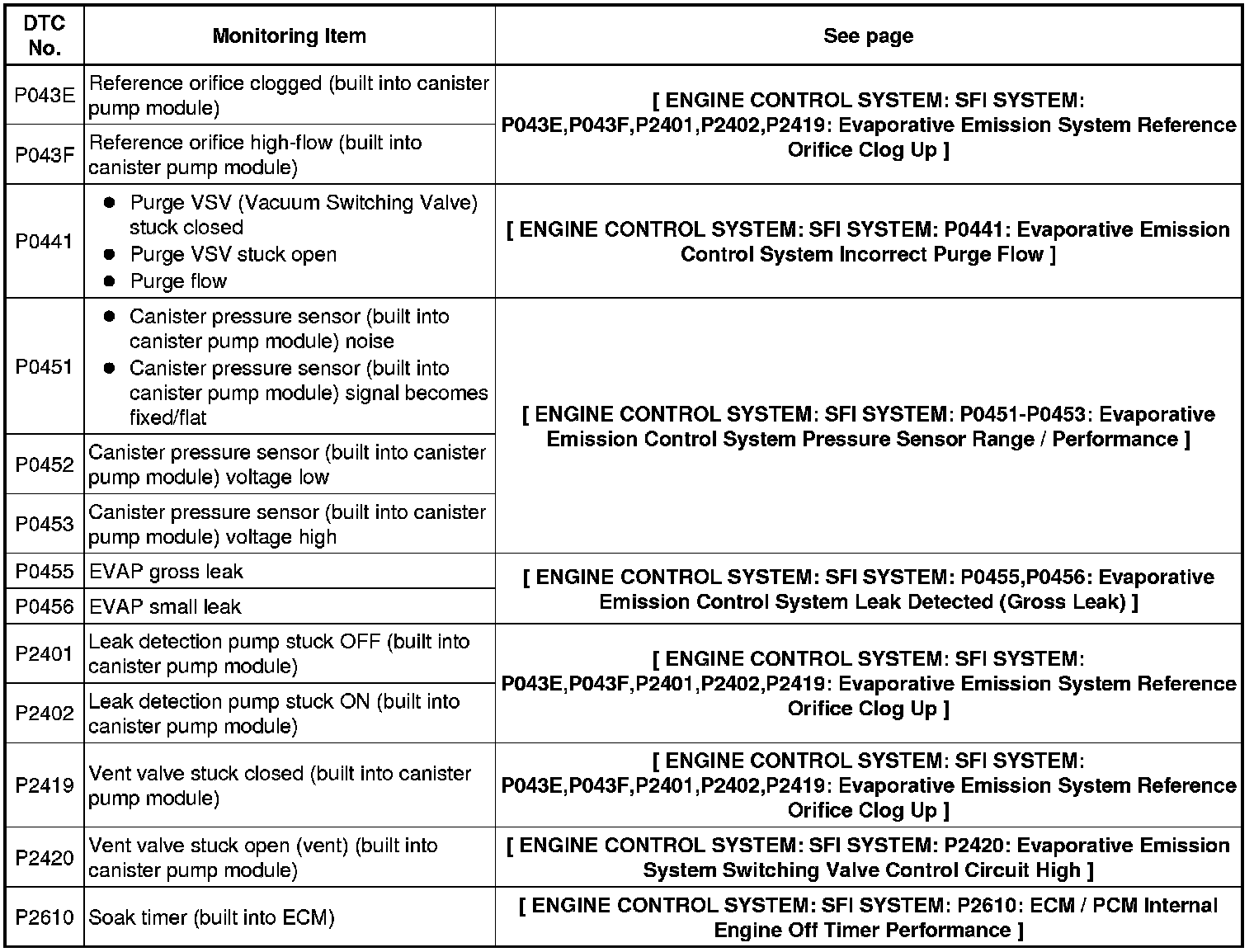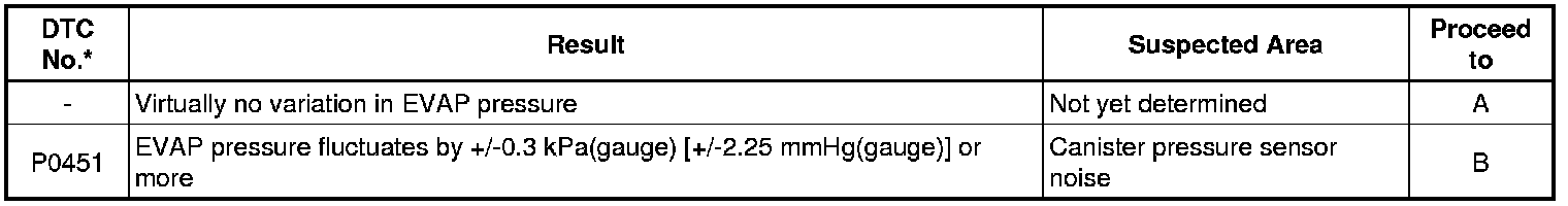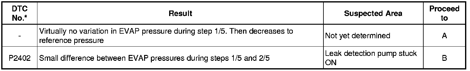 If any EVAP system DTCs are stored, the malfunctioning area can be determined using the table below.