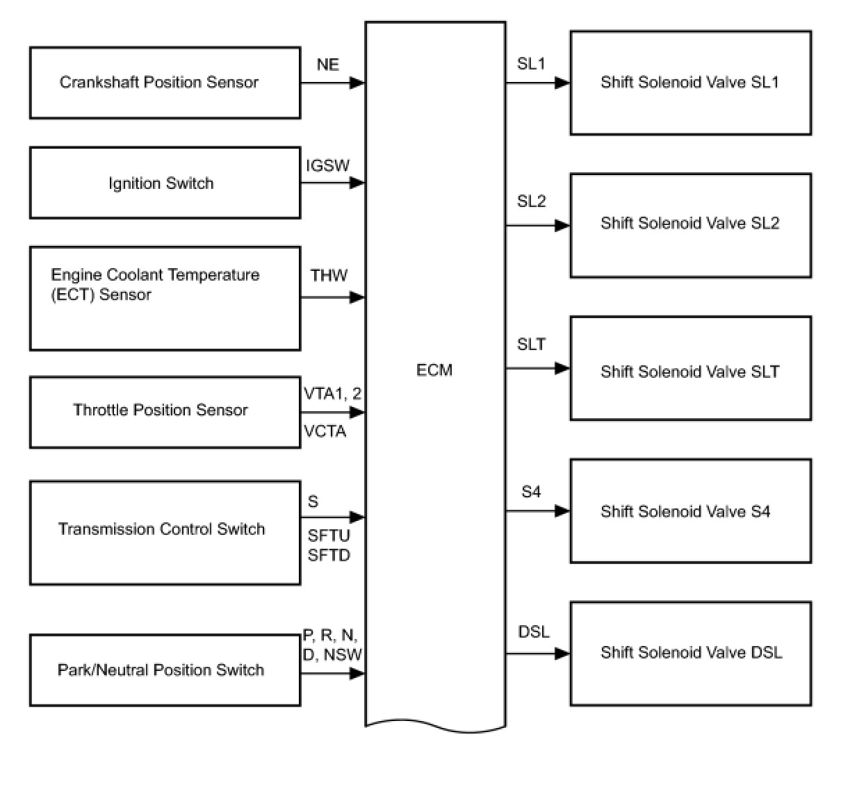 (a) The Electronic Controlled Automatic Transaxle (ECT) is an automatic transaxle that electronically controls shift timing using the Engine Control Module (ECM). The ECM detects electrical signals that indicate engine and driving conditions, and controls the shift point based on driver habits and road conditions. As a result, fuel efficiency and power transaxle performance are improved.