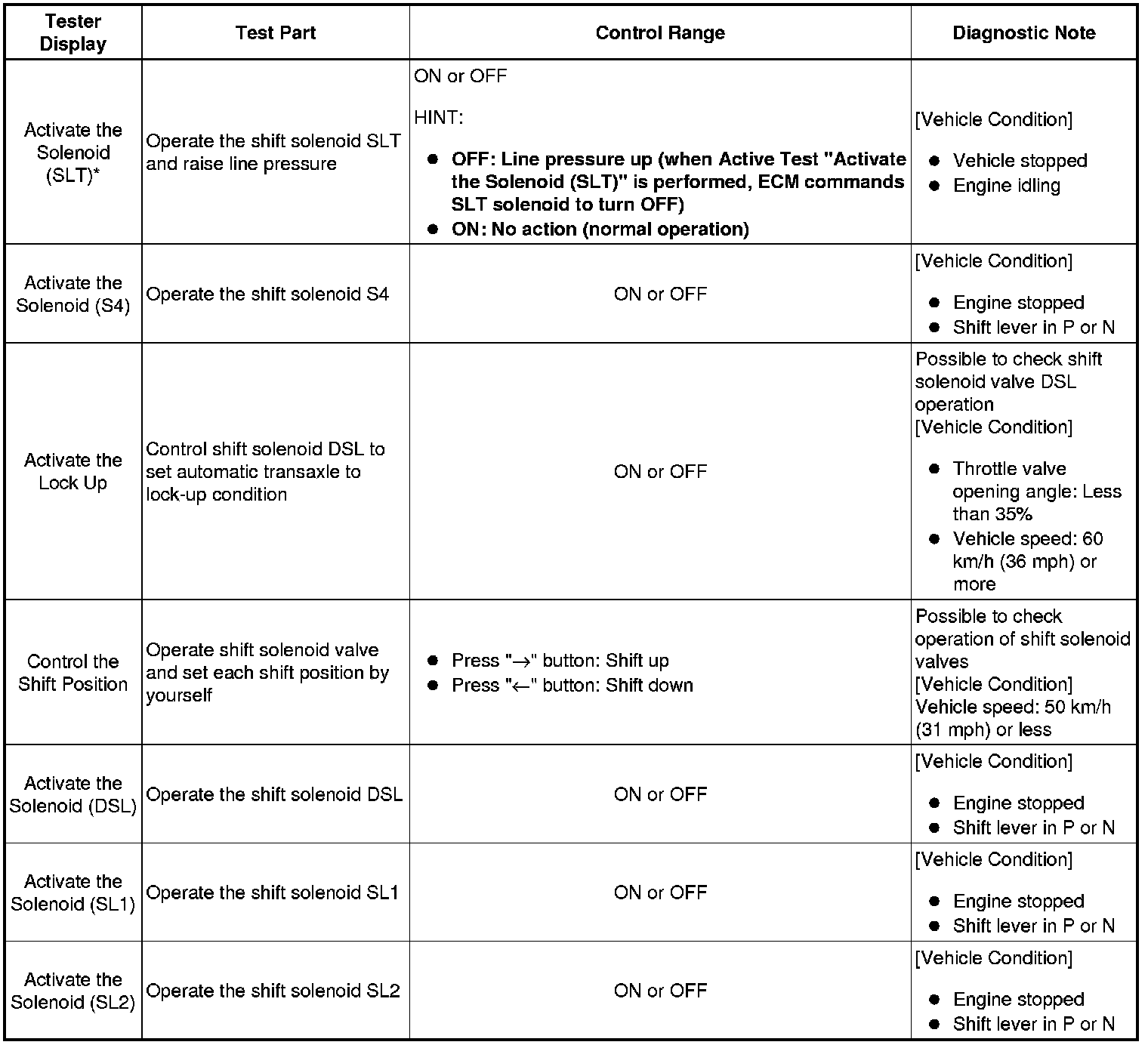*: Activate the Solenoid (SLT) in the Active Test is performed to check the line pressure changes by connecting SST to the automatic transaxle, which is used in the Hydraulic Test Hydraulic Test as well. Please note that the pressure values in the Active Test and Hydraulic Test are different.