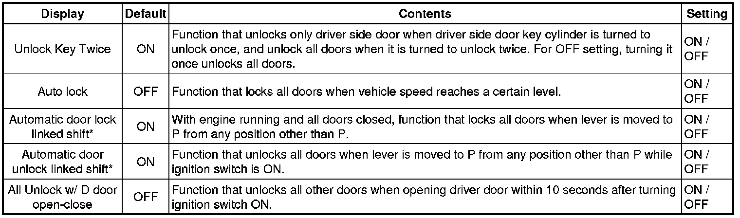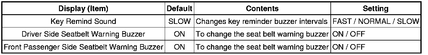 When the buzzer OFF setting is selected, the buzzer activation while the vehicle is being driven is cancelled. However, the buzzer activation when the ignition switch is turned to ON cannot be cancelled.