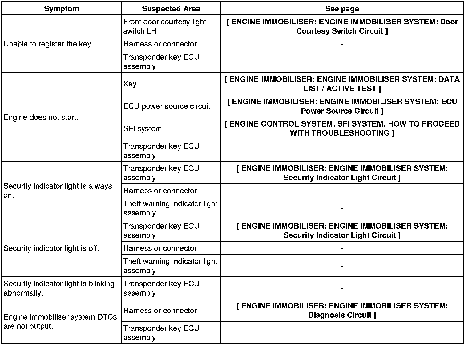 ENGINE IMMOBILISER: ENGINE IMMOBILISER SYSTEM: PROBLEM SYMPTOMS TABLE