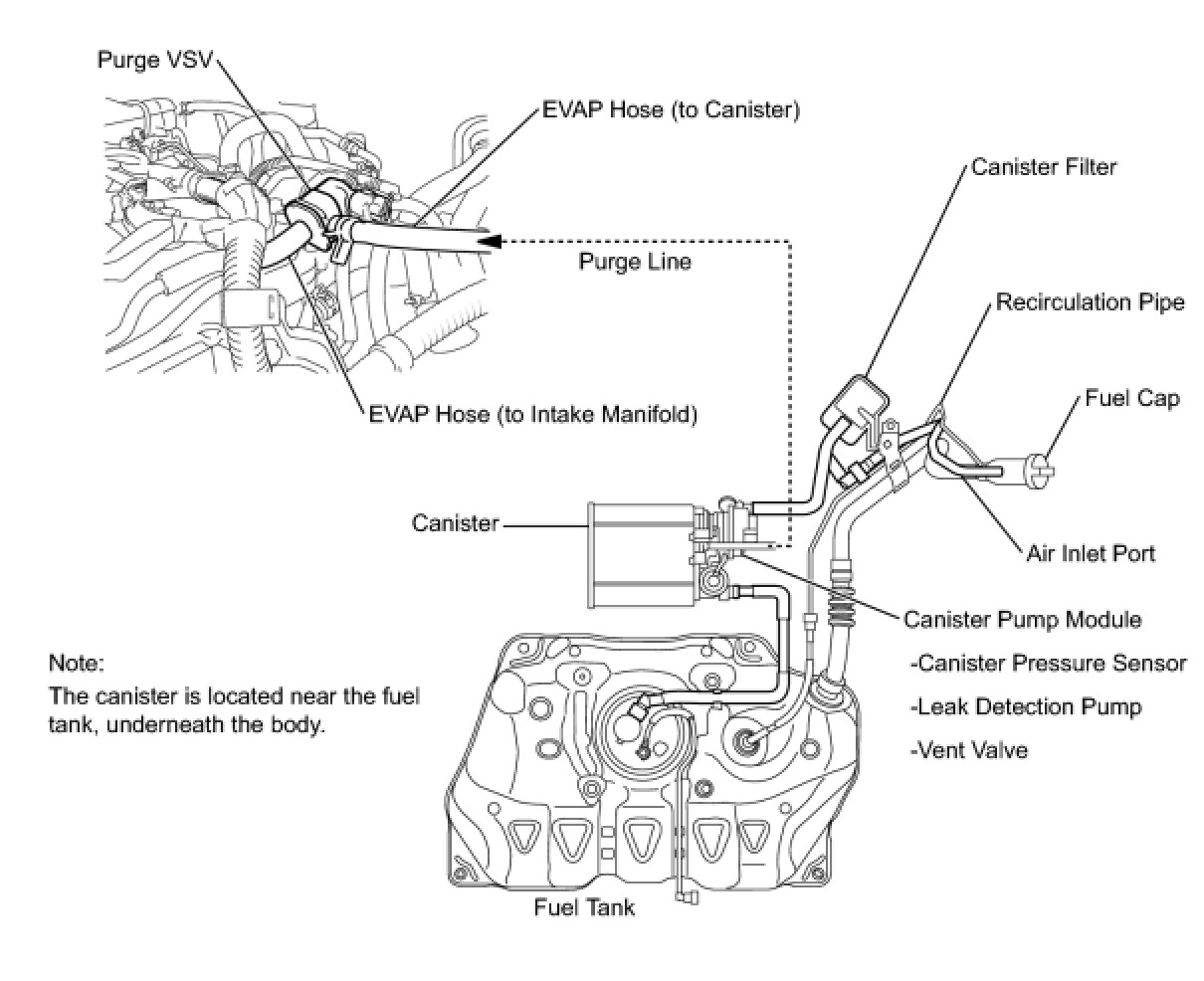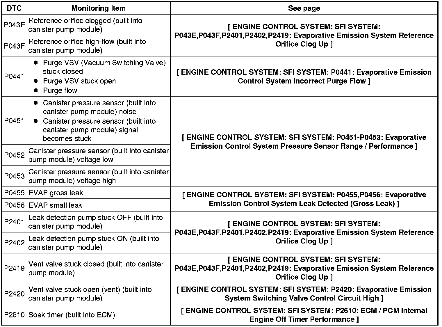 The leak detection pump creates negative pressure (vacuum) in the EVAP system and the pressure is measured. Finally, the ECM monitors for leaks from the EVAP system, and malfunctions in both the canister pump module and purge VSV, based on the EVAP pressure.