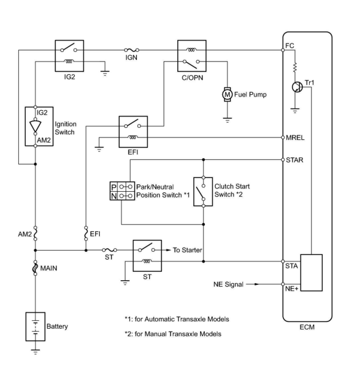 When the engine is cranked, the starter relay drive signal from the ignition switch is input into the STA terminal of the ECM, and the NE signal generated by the crankshaft position sensor is also input into the NE+ terminal. Thus, the ECM interprets that the engine is being cranked, and turns transistor Tr1 in the ECM internal circuit ON. The current flows to the C/OPN (Circuit Opening) relay by turning Tr1 ON. Then, the fuel pump operates.