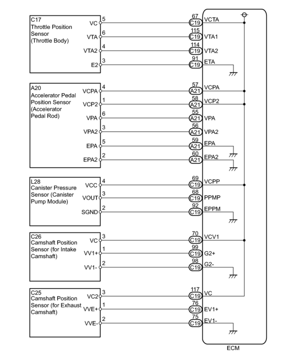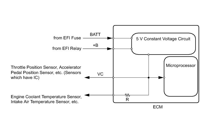 The ECM constantly generates 5 V power from the battery voltage supplied to the +B (BATT) terminal to operate the microprocessor. The ECM also provides this power to the sensors through the VC output circuit.