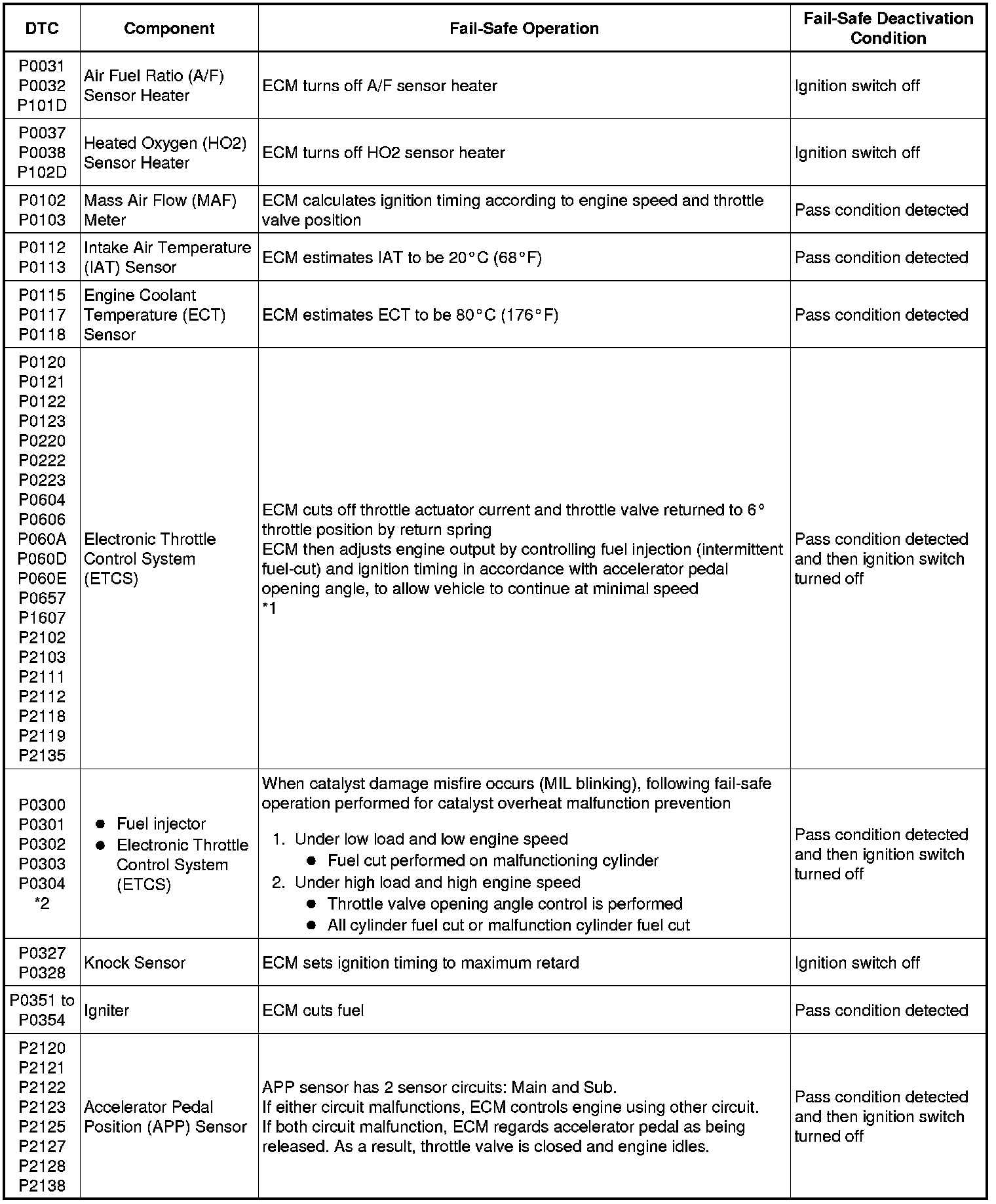 If any of the following DTCs are set, the ECM enters fail-safe mode to allow the vehicle to be driven temporarily or stops fuel injection.