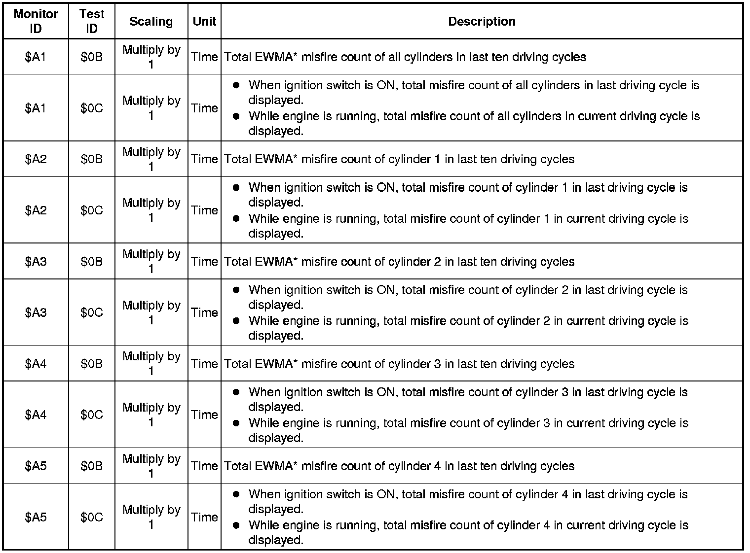 *: EWMA (Exponential Weighted Moving Average) misfire counts for last 10 driving cycles (calculated) Calculation: 0.1 x (current counts) + 0.9 x (previous average) Initial value for (previous average) = 0