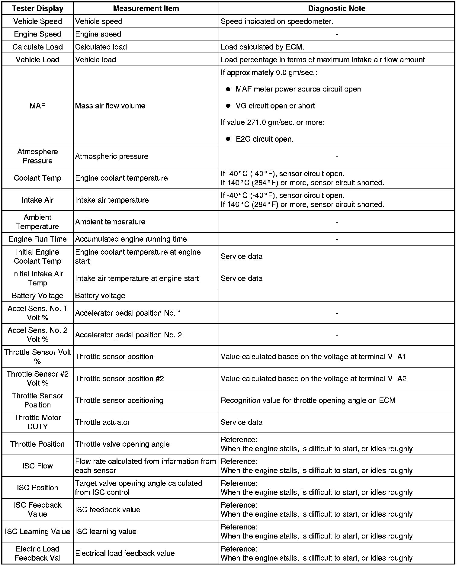 * The ECM records vehicle and driving condition information as freeze frame data the moment a DTC is stored. When troubleshooting, freeze frame data can be helpful in determining whether the vehicle was moving or stationary, whether the engine was warmed up or not, whether the air-fuel ratio was lean or rich, as well as other data recorded at the time of a malfunction.